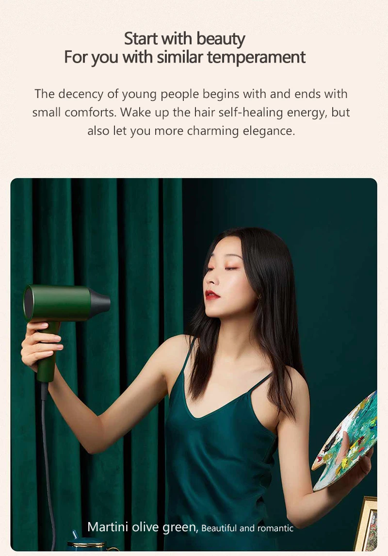 Уход за волосами с отрицательными ионами, интеллектуальная постоянная температура NTC, сбалансированное распределение тепла, не повреждает волосы. Магнитное сопло не нужно беспокоиться о том, что оно выпадет через долгое время. Матовая текстура очень приятная на ощупь, темно-зеленый цвет также очень положительный. Мне очень нравится. Время выдувания волос также очень быстрое, а объем воздуха относительно большой. Качество цепочки производства просо также должно быть гарантировано.