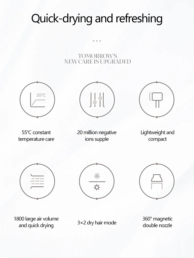 Эта маленькая фен выглядит очень красиво. Дизайн очень современный. Также очень удобно в эксплуатации. Вы можете переключаться между горячим и холодным, нажав один раз. Низкий уровень шума не очень громкий, что приемлемо. Установка ветровой головки Магнитного Всасывания очень удобна. Есть два уровня ветра, и низкий уровень ветра уже очень сильный. Намного удобнее высушить волосы