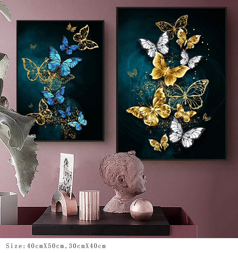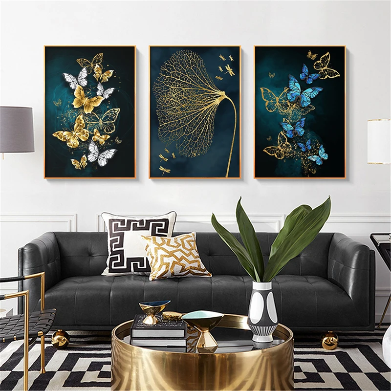 Современная абстракция синяя Золотая Бабочка настенный художественный холст картина, печатный плакат Nordic декоративная картина для Гостиная домашний декор