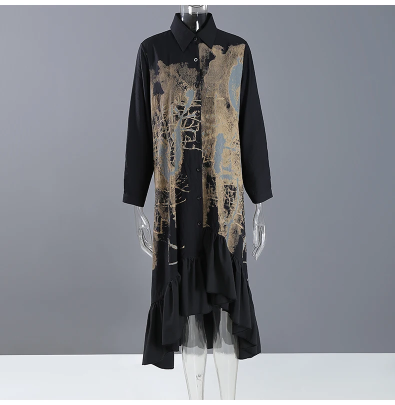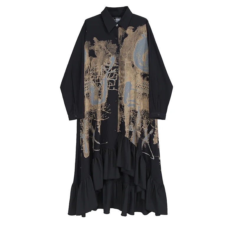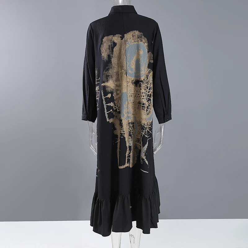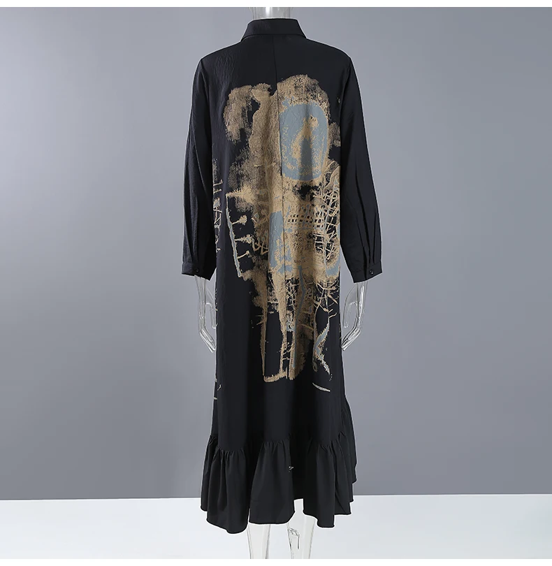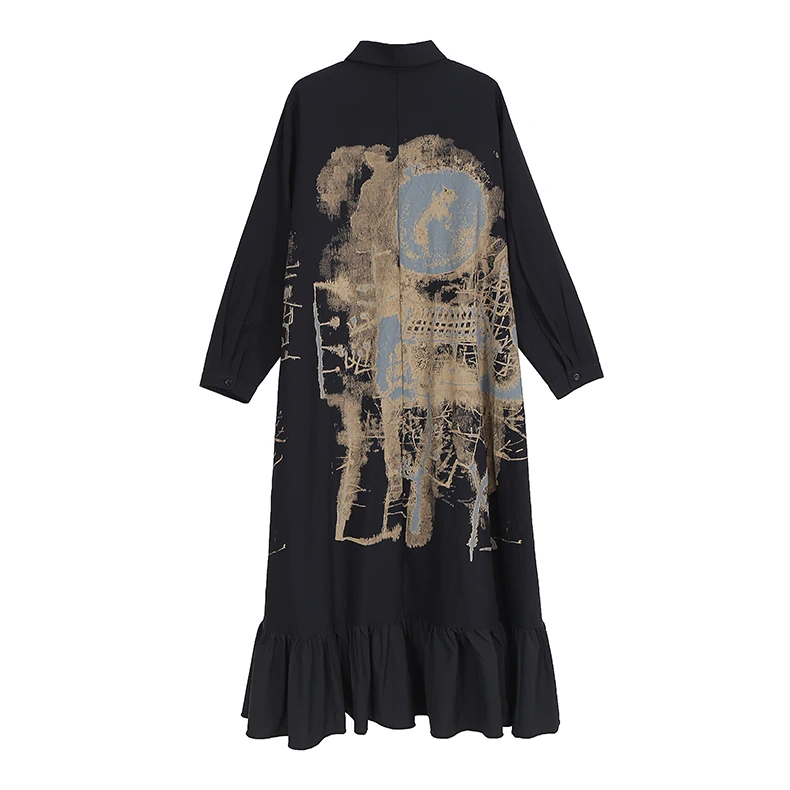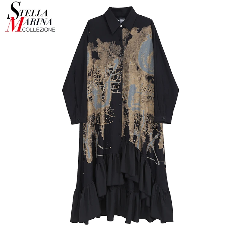 Новинка, весеннее женское винтажное платье-рубашка черного цвета с длинными рукавами и рисунком, с оборками и подолом, женские платья в стиле ретро, Robe Femme 8188