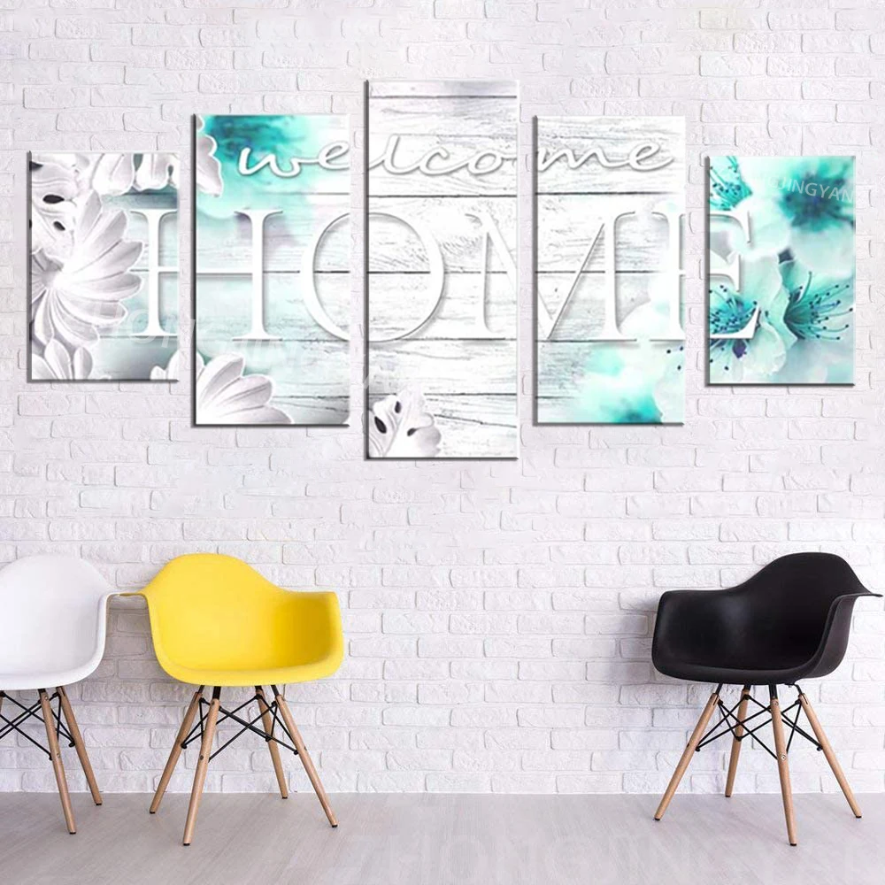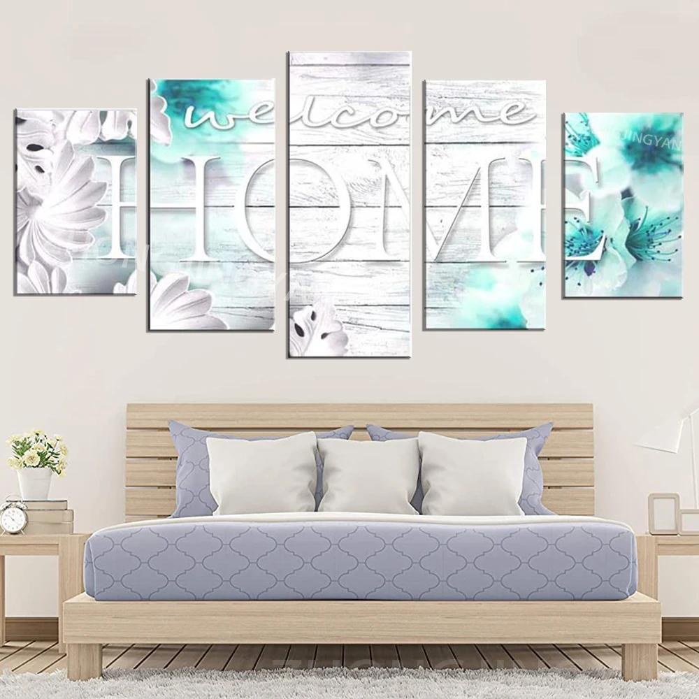 Настенное искусство Добро пожаловать домой знак бирюза винтажный Сладкий Декор современные абстрактные 5 панелей картина холст цветочное украшение