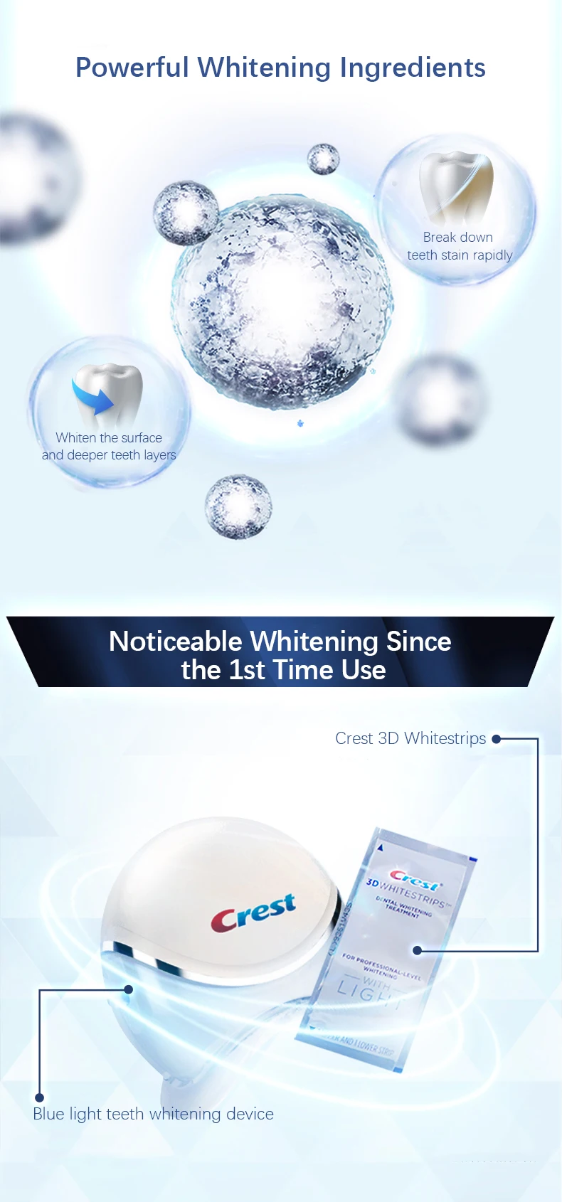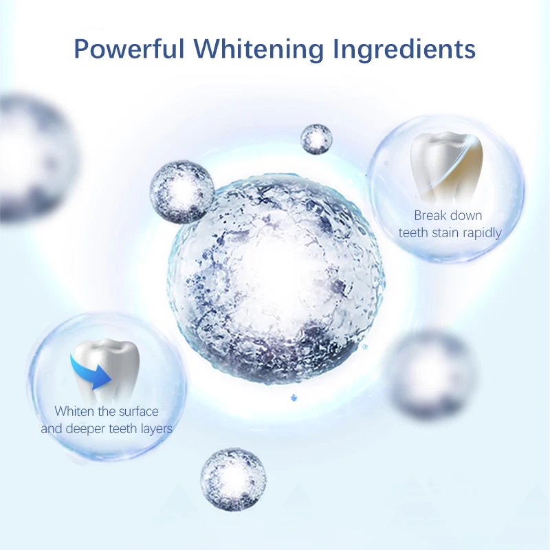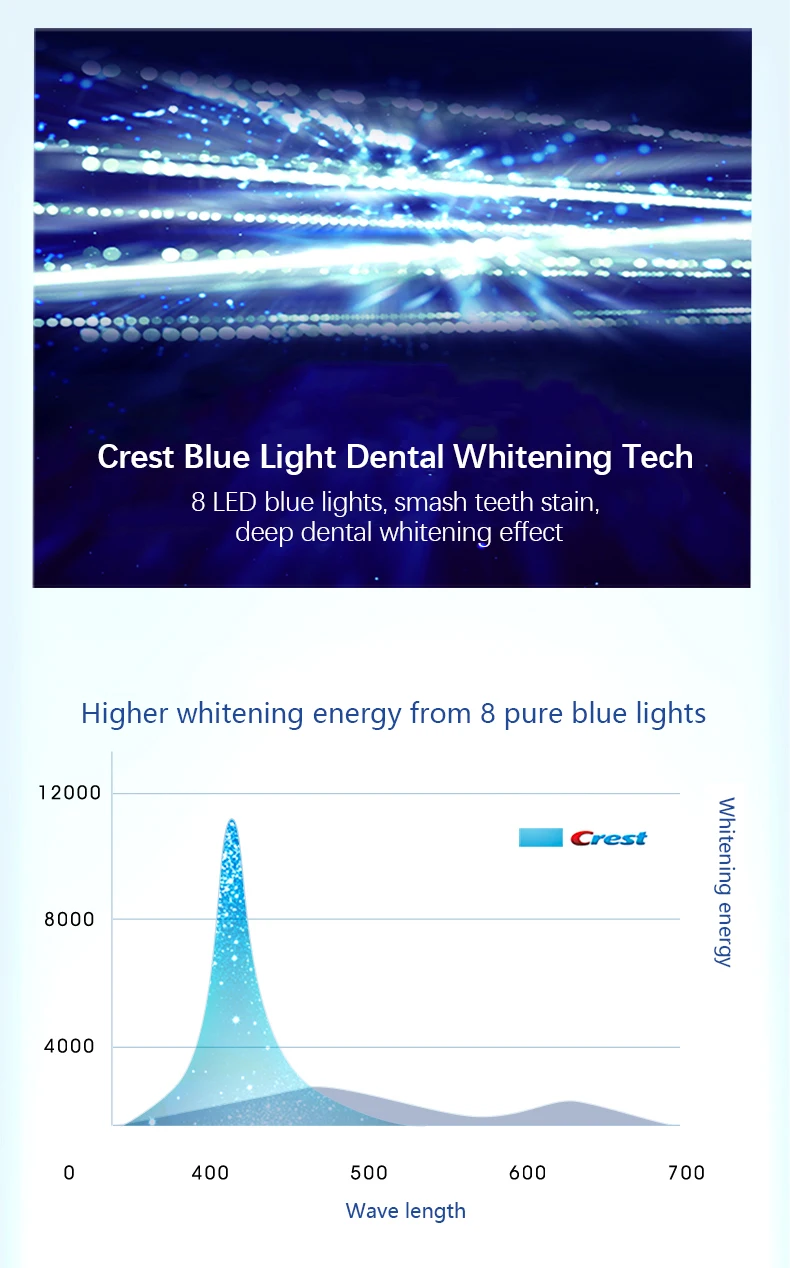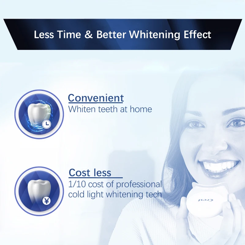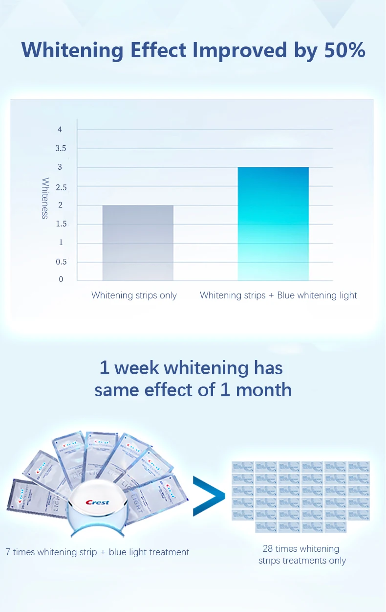 Особенность: Экспресс-отбеливание, заметный отбеливающий эффект с первого использования, whitestrips + синий свет, использование 7 раз имеет тот же эффект с 28 раз отбеливания только.