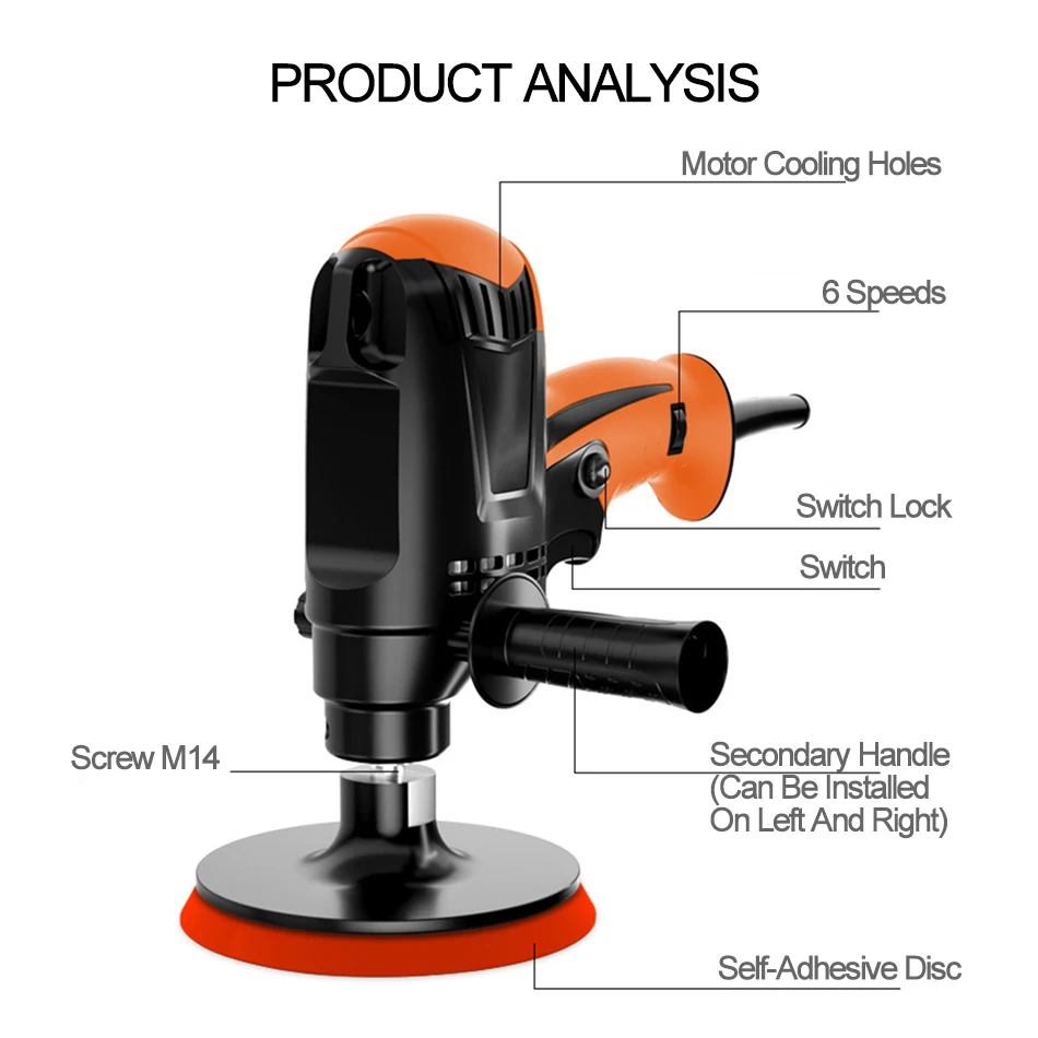 Особенности: 1,980 Вт Медный двигатель 2,6 регулирование скорости 3. Низкий уровень шума 4. Конструкция отведения тепла вверх и вниз 5. Простое управление 6. Легкий и удобный Спецификация: Цвет: оранжевый Размеры: 26,5*21*13 см Напряжение: 220 В Частота: 50 Гц Мощность: 980 Вт Скорость: 850-3200р/мин Мотор: двигатель из чистой меди Положение шестерни: 6 скоростей Диапазон использования: Полировка и восковая машина, полы, диваны, шкафы, пианино и т. Д.