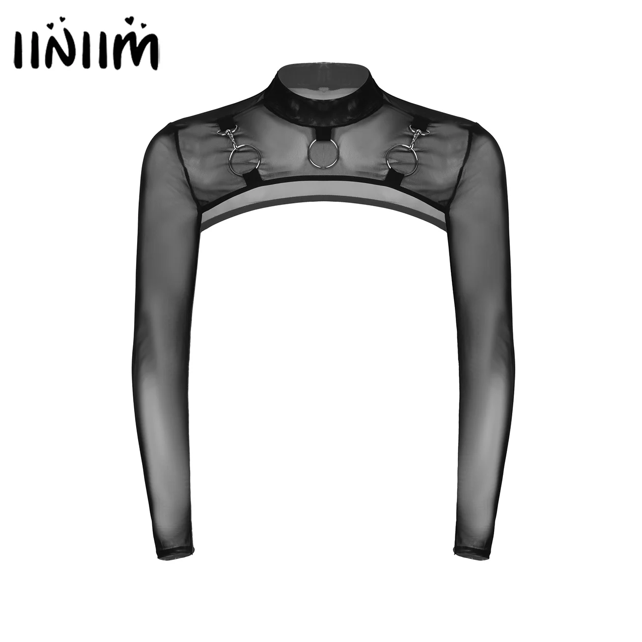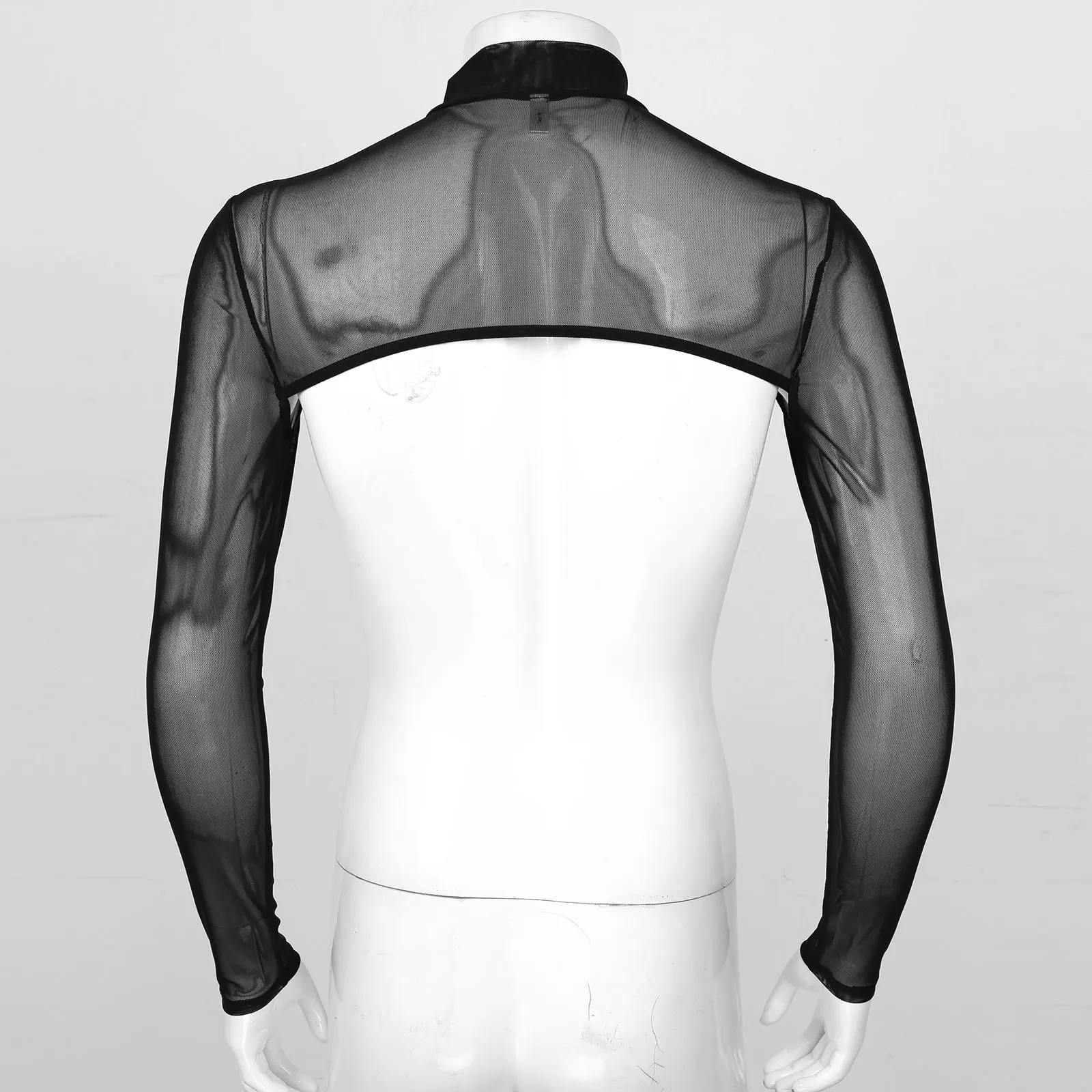 Мужские сексуальные топы iiniim с ложным воротником, с длинным рукавом и круглым вырезом, блестящий сетчатый полутоп, Клубная одежда для вечерние
