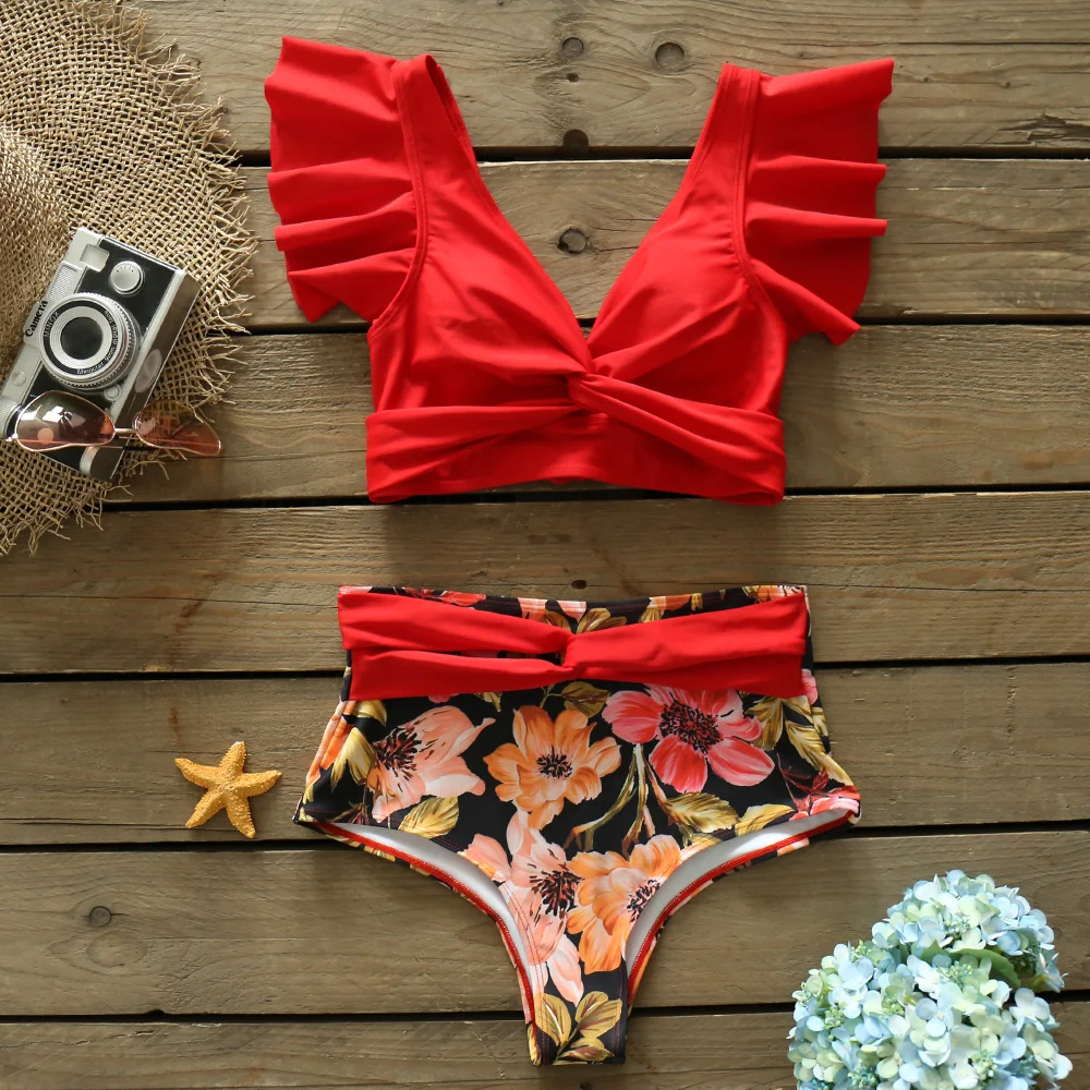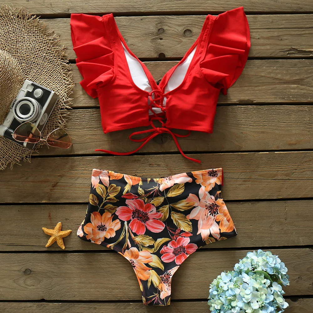 2021 сексуальные бикини, женский купальник, купальник с оборками на плечах, купальный костюм с высокой талией, пляжная одежда, бикини для женщин
