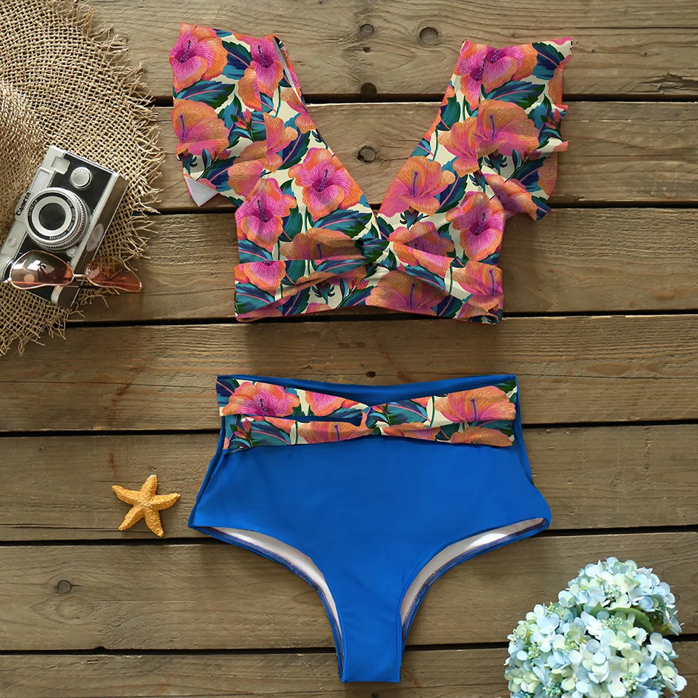 Купальник-бикини женский со средней талией и цветочным принтом