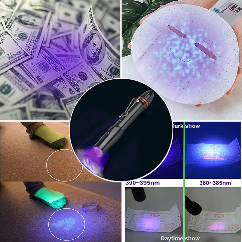 УФ-светильник детектор мочи домашних животных нм подходит для сушки ногтей, охоты на скорпионов, флуоресцентный датчик, отверждения клея, или зарядки, подсветки грибов, детектора гостиничных номеров, следа невидимых чернил и т. д.УФ 395нм свет: светильникУФ 365 нм свет: «слабый» фиолетовый светильник, но делает объект лучше видимым
