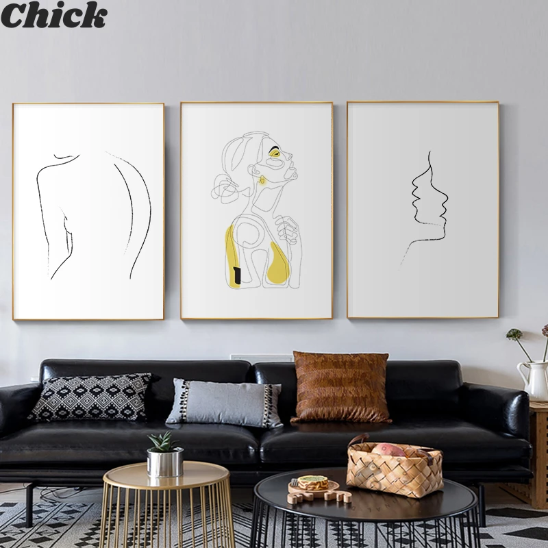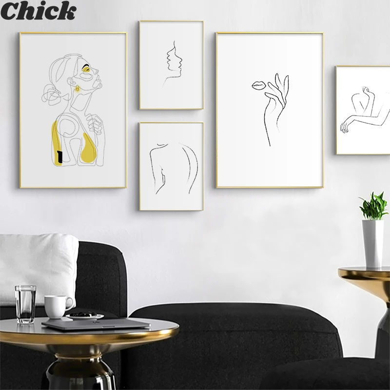 Абстрактная Женская линия, рисунок, скандинавский плакат и принты, Современная Картина на холсте, настенное искусство, желтая девушка, Настенная картина, спальня, домашний декор