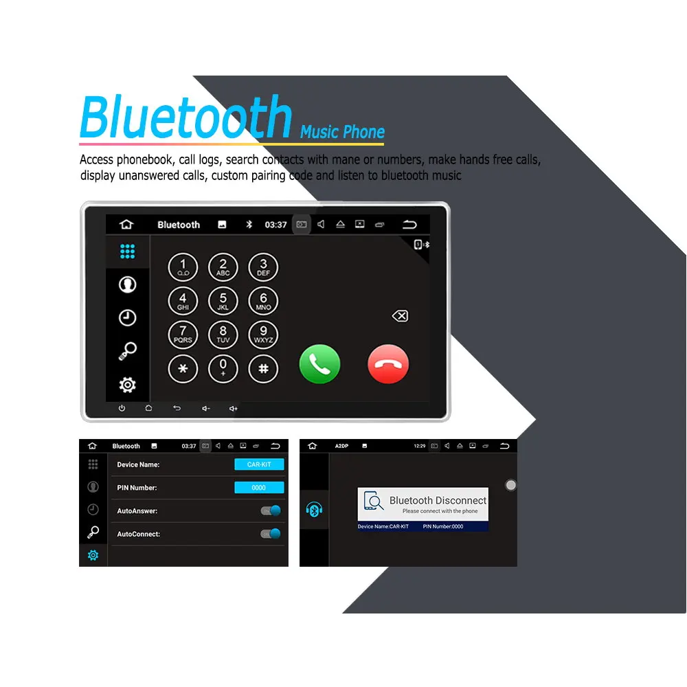 Встроенный Bluetooth для звонков в режиме hands free, поддержка A2DP для воспроизведения музыки с телефона через функцию bluetooth, поддержка функции телефонной книги с контактами и поддержка клавиатуры для поиска имени контакта.