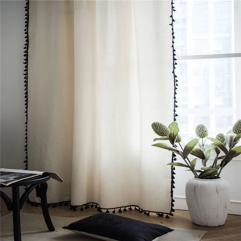 Занавеска с кисточками для окон, Современная хлопково-льняная белая полузатеняющая ткань в простом стиле, украшение для дома, гостиной