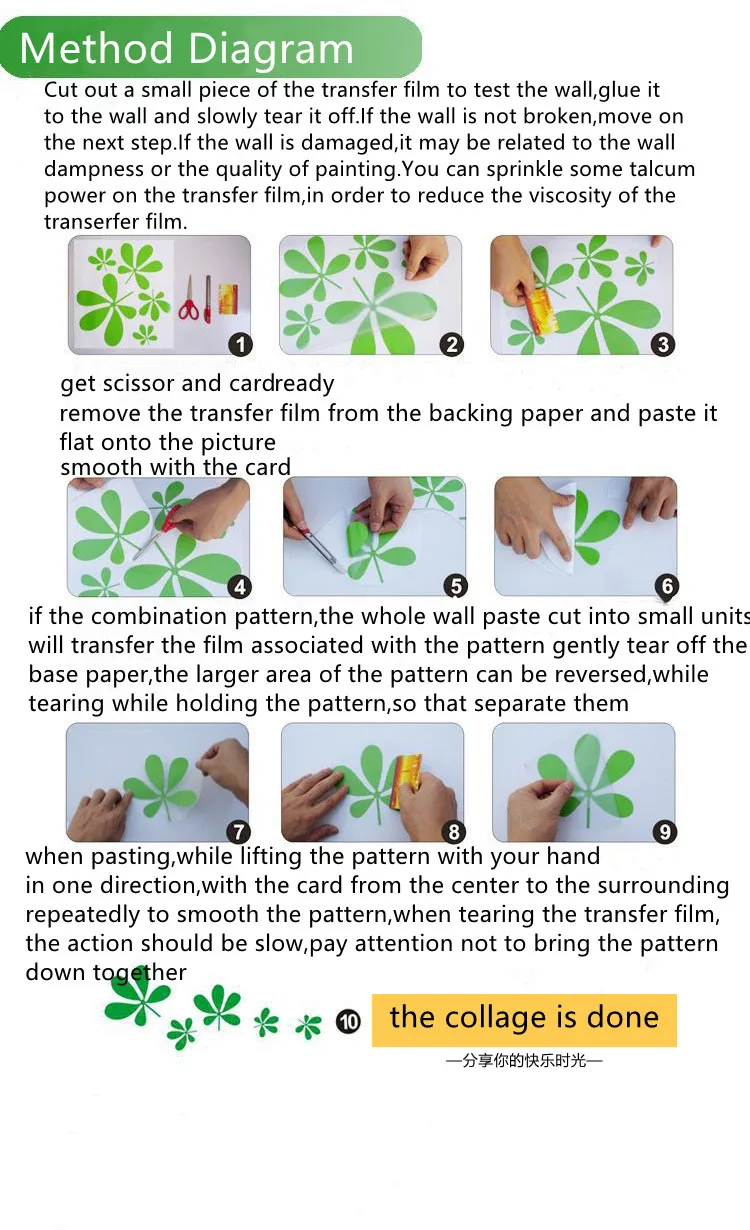 4.Если наклейка на стену находится в неправильном положении, можно аккуратно приподнять угол наклейки с помощью небольшого лезвия, оторвать ее, а затем снова наклеить. Этот продукт можно использовать повторно при нормальных обстоятельствах, если он не рвется;