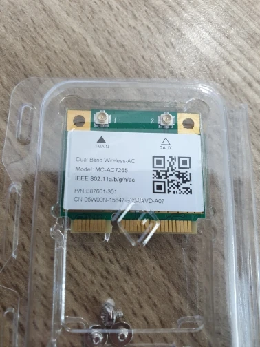 Модель: MC-AC7265; Интерфейс: Половина Mini PCI-E; Диапазон частот: 2,4 г/5 ГГц; Сетевой стандарт: 802.11ac; 802.11a/b/g/n; Макс Скорость: 867 Мбит/с на Wi-Fi 5 ГГц, 300 Мбит/с на 2,4 ГГц Версия Bluetooth: Bluetooth 4,2 Поддержка: Windows 7/8/10, Linux Совместим с: поддерживает почти ноутбук с интерфейсом Mini PCI-E, таким как Asus, Acer, Dell, Samsung, Toshiba, Sony и т. Д. Не подходит для ноутбука IBM/HP/Lenovo/ThinkPad