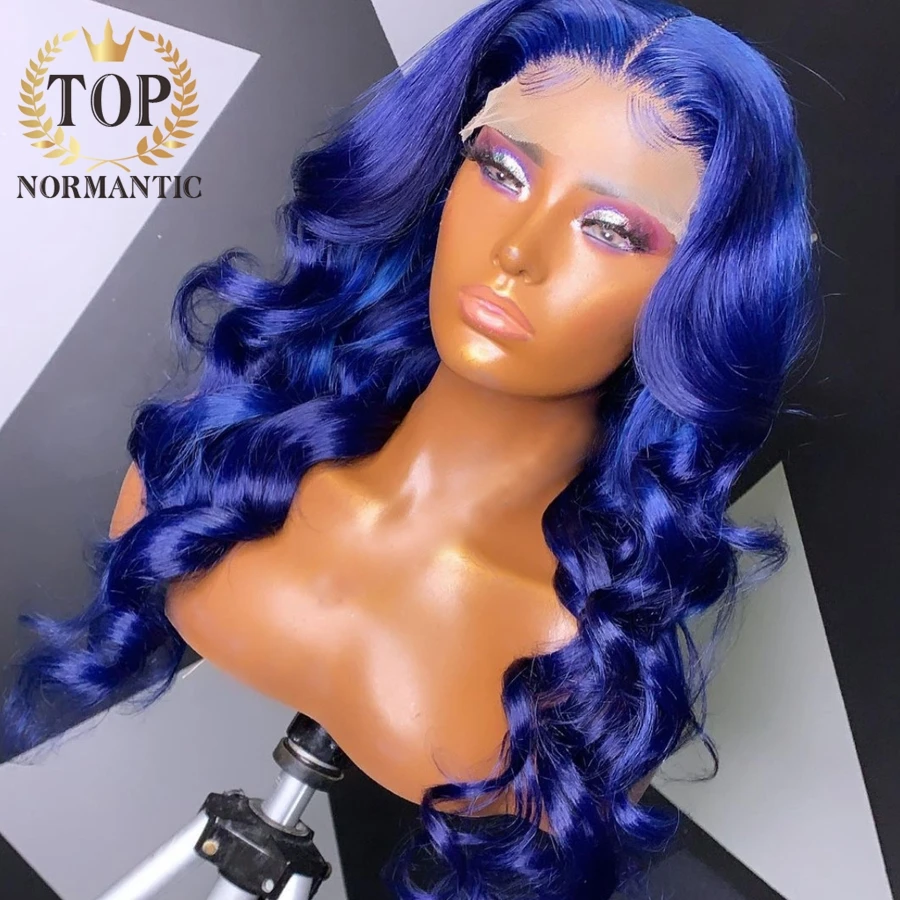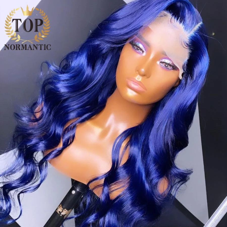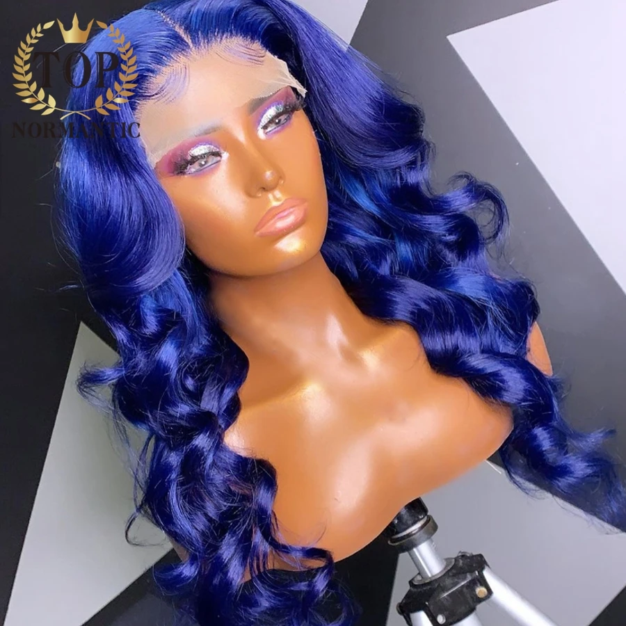 Topnormantic Королевский синий цвет свободные волнистые кружевные передние парики готовые бразильские человеческие волосы Remy синий цвет волнистые парики для женщин