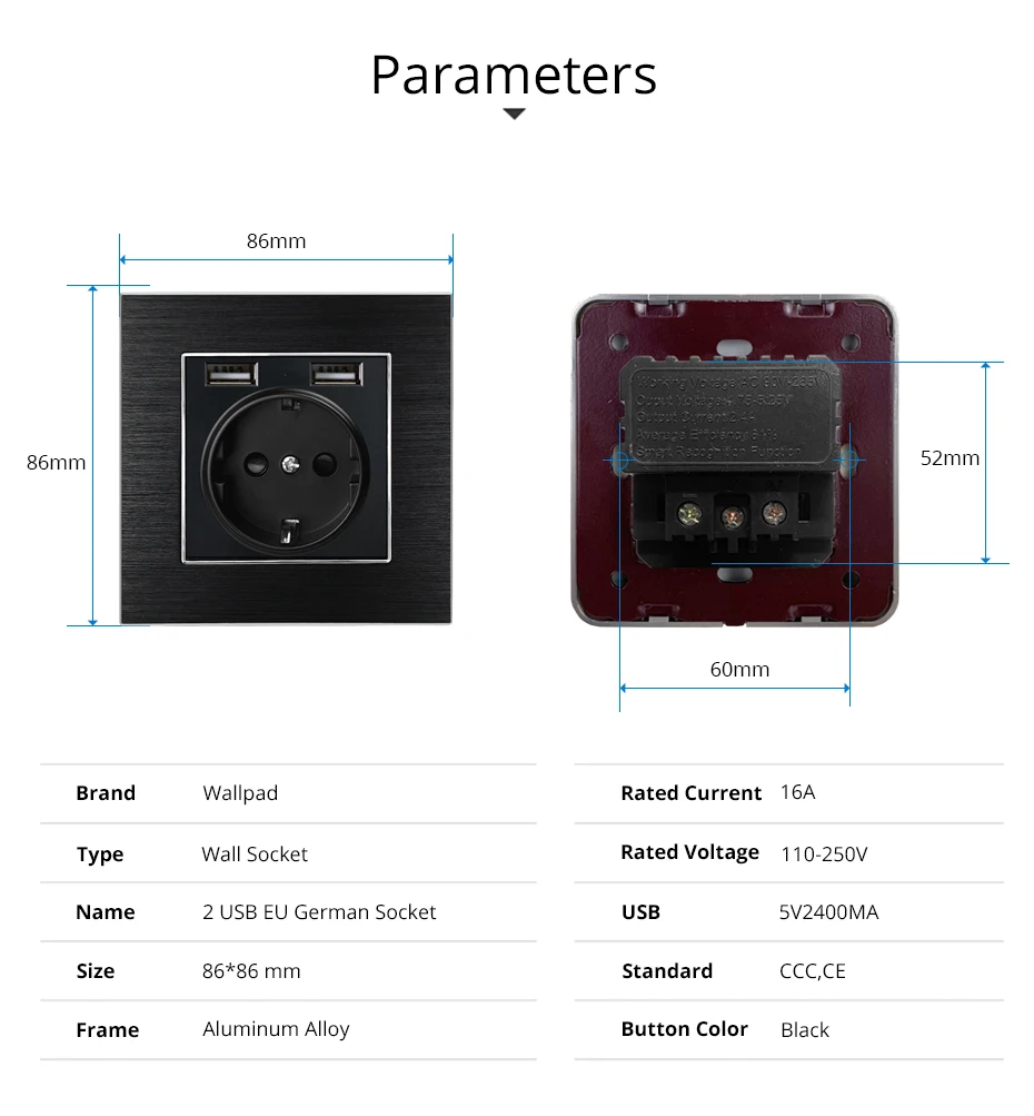 Европейская немецкая розетка с 2 Usb в стене, Роскошная атласная металлическая панель, USB настенная розетка