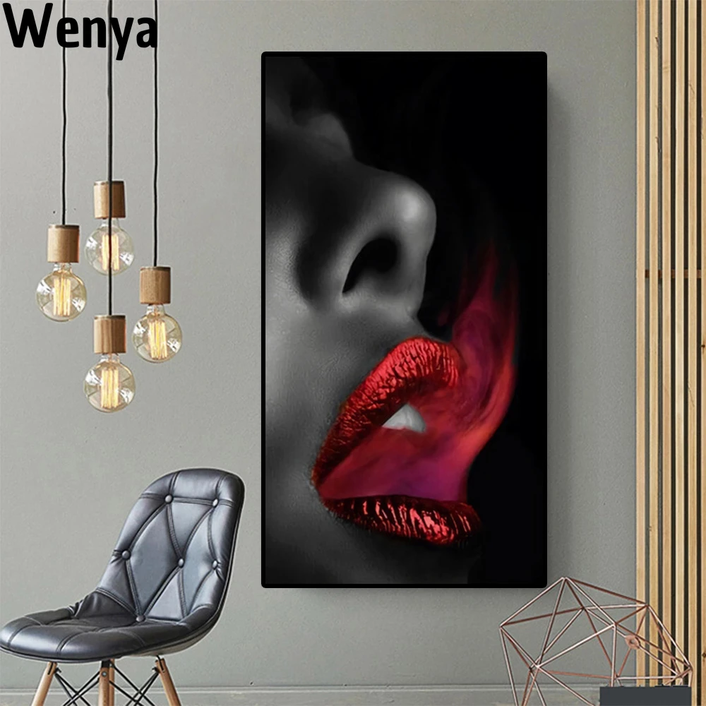 Современное искусство картина маслом постер женщина сексуальные красные губы вертел красный дым на холсте постер и печать гостиная картина украшение дома