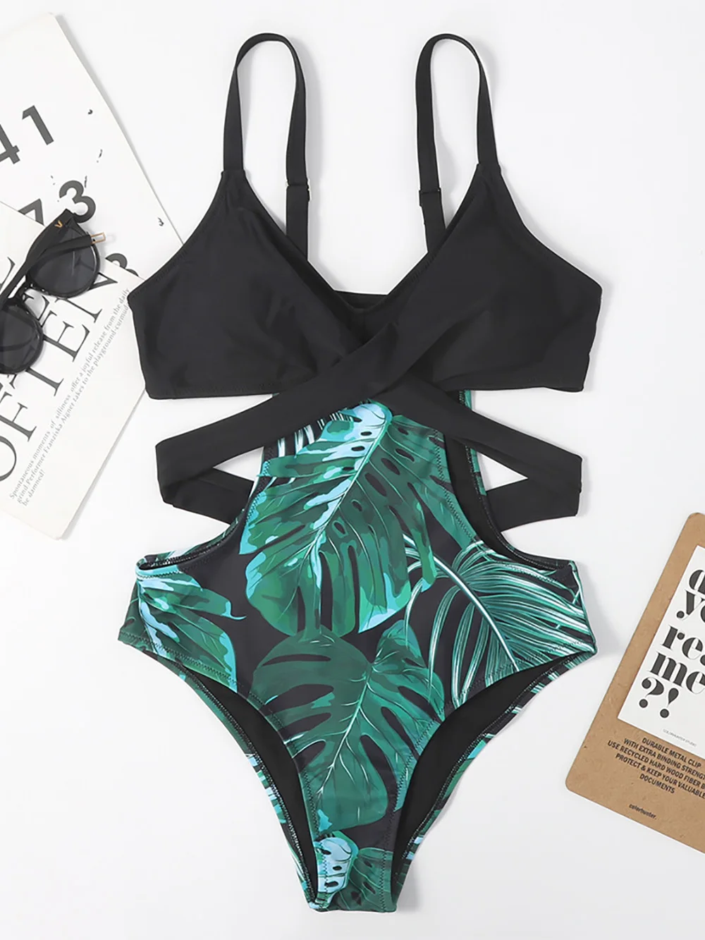 Женский купальный костюм с принтом тропических листьев и высокой талией сексуальный бандажный Цельный купальник вырезами пляжная одежда для плавания монокини 2022 слитный купальни 2022 талия женский тропический принт