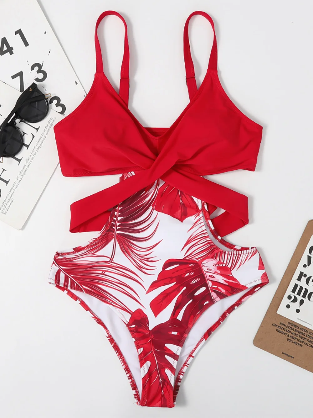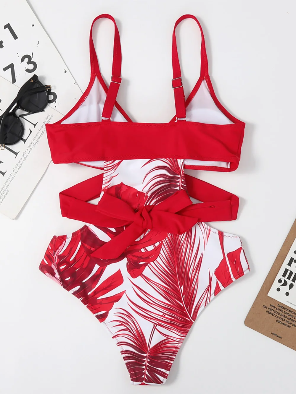 Женский слитный купальник, красный купальник с принтом листьев, сек...