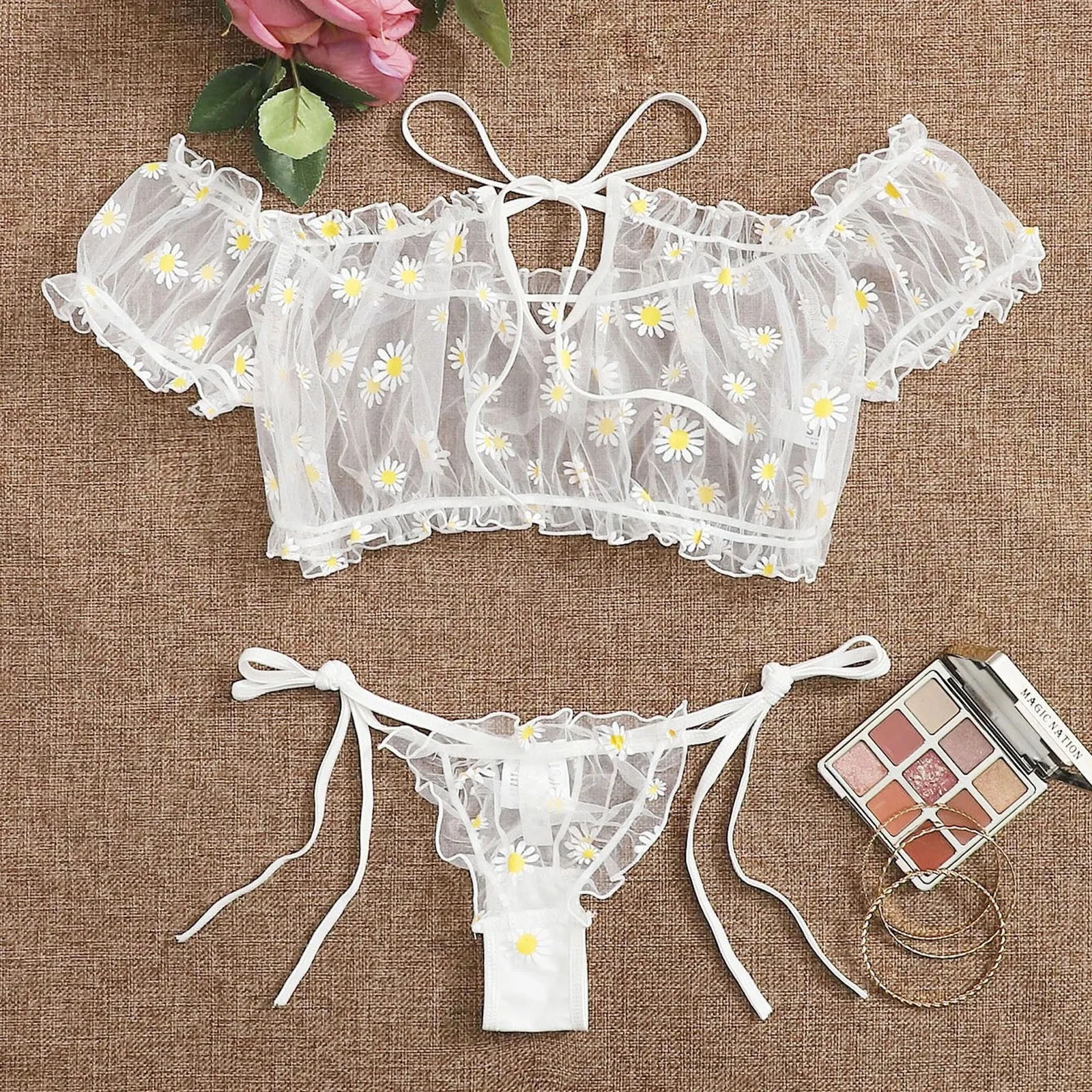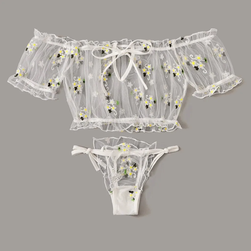 Женская кружевная Пижама без бретелек с вышивкой и бантом, бюстгальтер и тонкие прозрячные трусики в комплекте