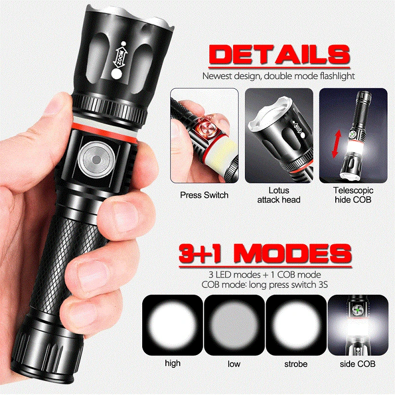 Высококачественный Мощный фонарикБренд: PocketmanМодель: AK771/AK772Источник светильник: L2/T6 + COBЦвет внешнего вида: черныйИсточник питания: 1 аккумулятор 18650Время освещения: 2-8 часовСпособ зарядки: Прямая зарядка через USBДиапазон: 500 метровКласс водонепроницаемости: IPX-6Вес нетто: 200 г (без батареи)Материал корпуса: алюминиевый сплавМасштабируемый: Регулируемый фокусМатериал: алюминиевый сплав3 режима переключения: сильный светильник-слабысветильник-вспышка-COB (Длительное нажатие в течение трех секунд)Это тактический светодиодный фонарь из алюминиевого сплаваВнутренняя проводка использует схему высокоэффективного усилителя и может использовать батареи по максимуму.Подходит для любителей спорта на открытом воздухе, таких как охота, езда на велосипеде, рыбалка, скалолазание, кемпинг и т. д.