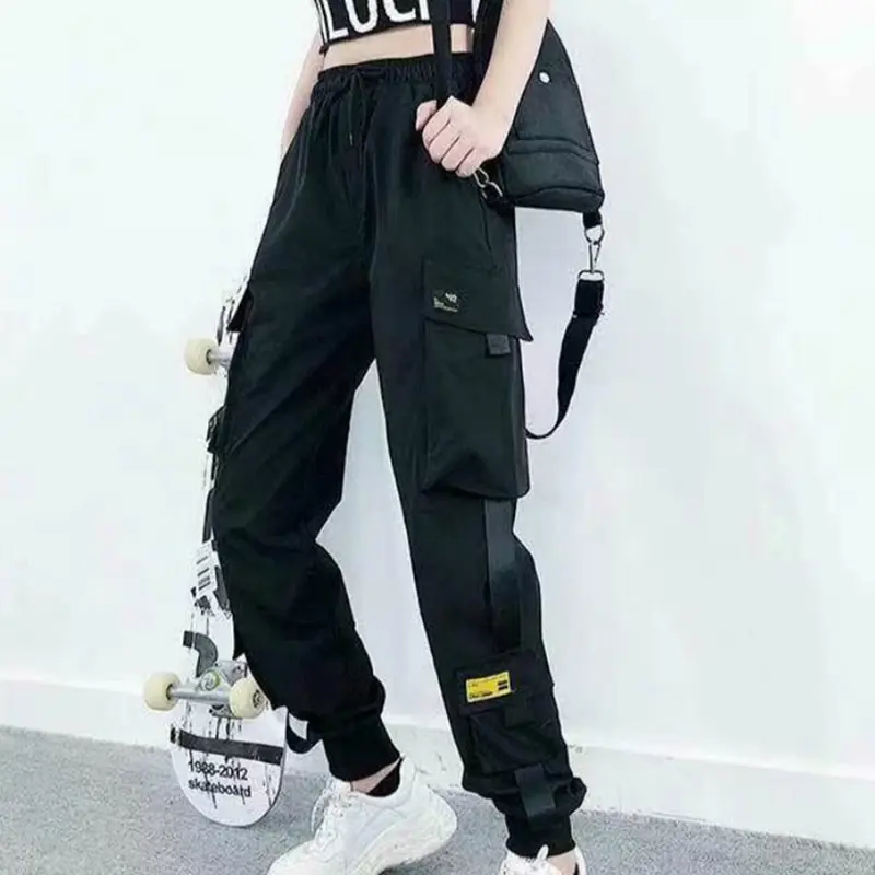 Для женщин брюки карго черная лента карман брюки для девочек с эластичной резинкой на талии Высокая Уличная Брюки в стиле Харадзюку в стиле панк, женские брюки