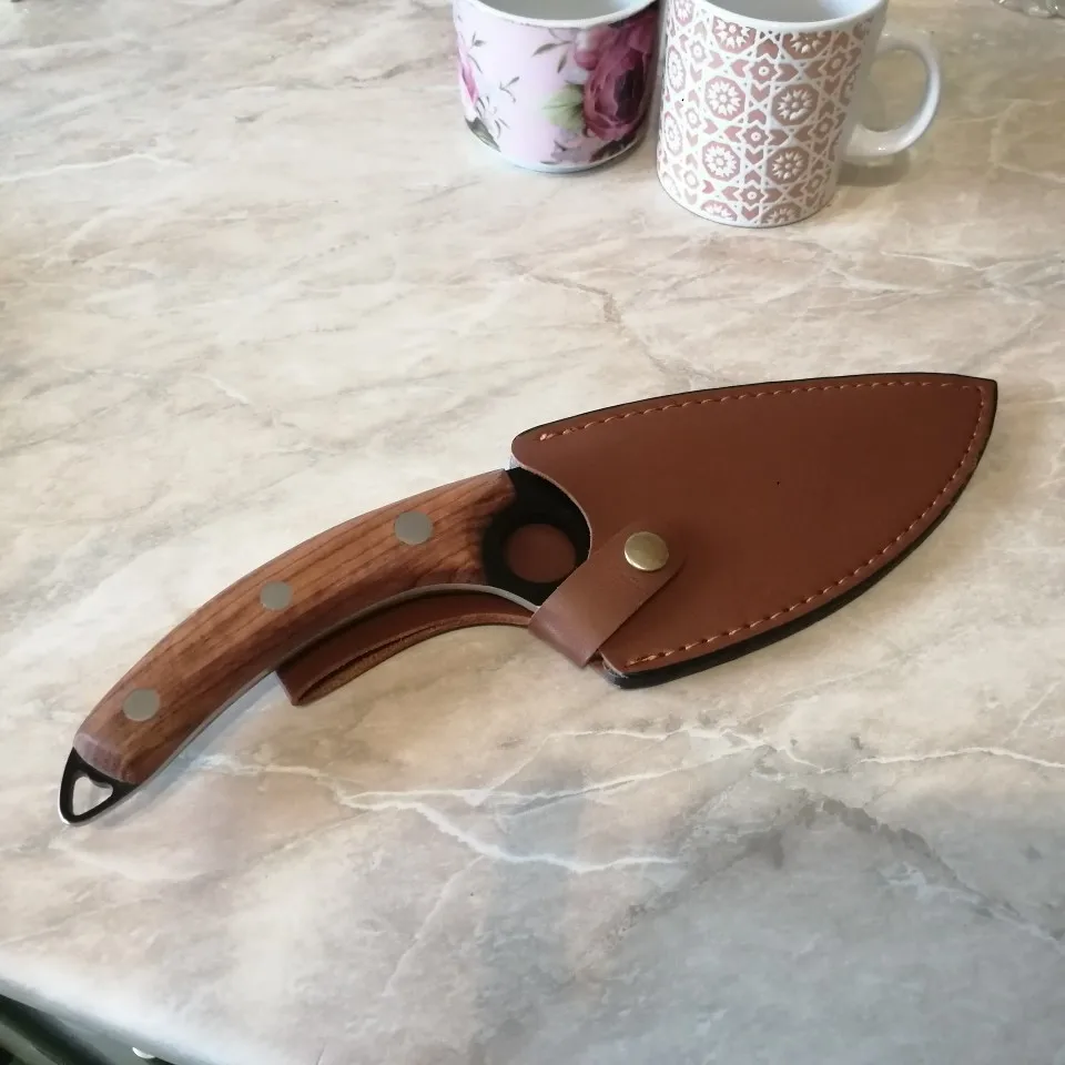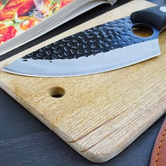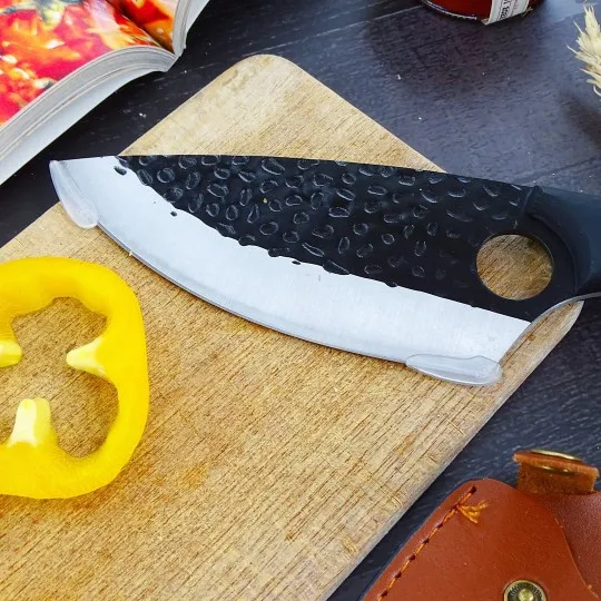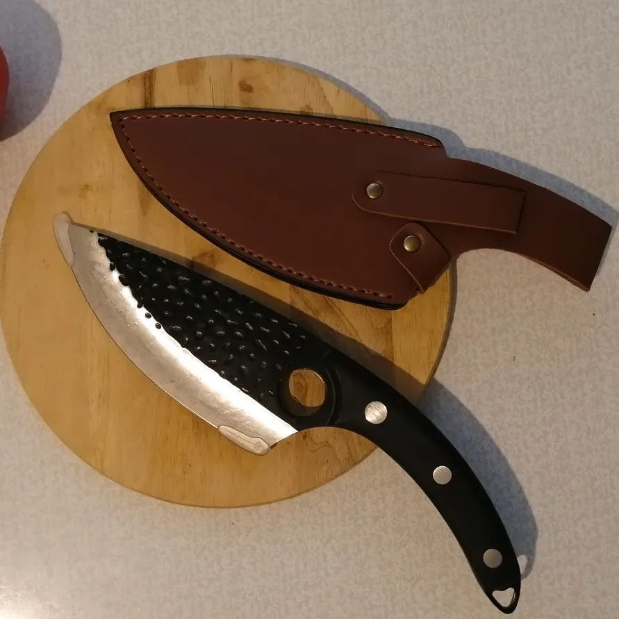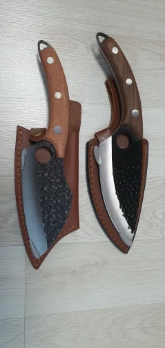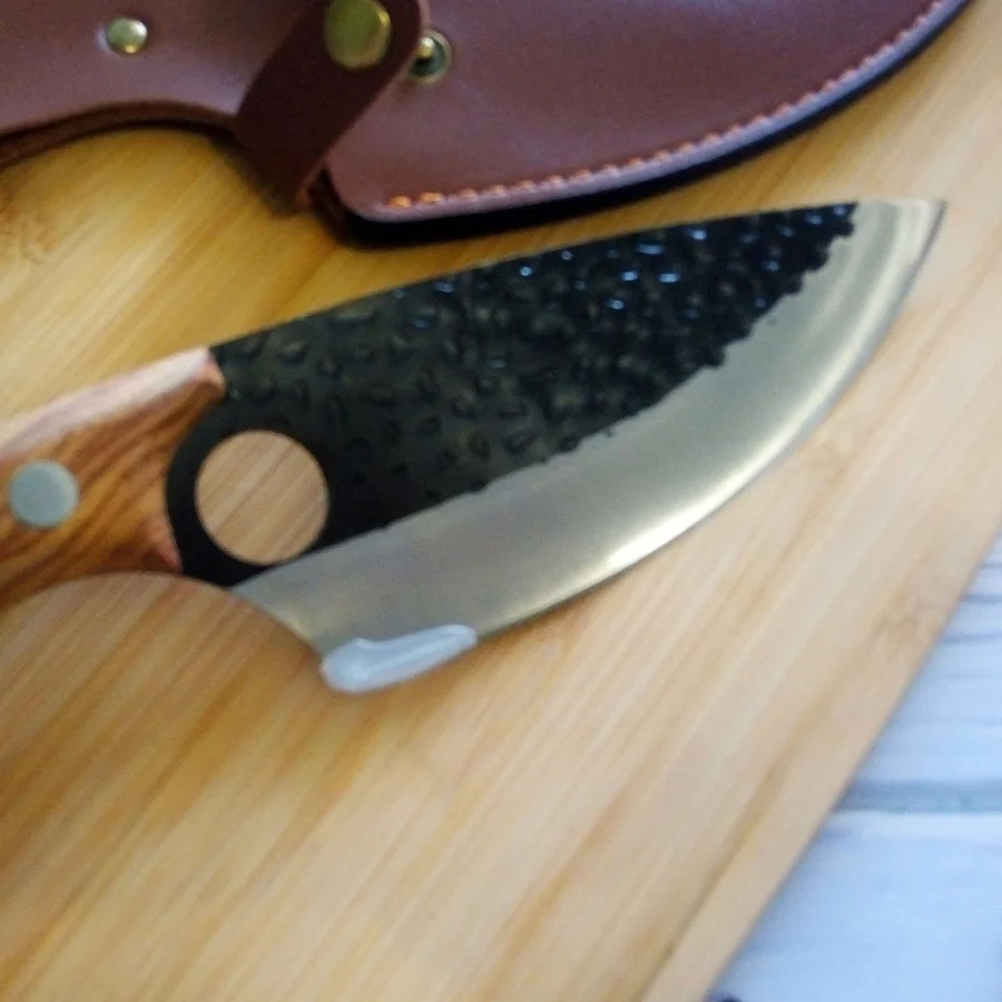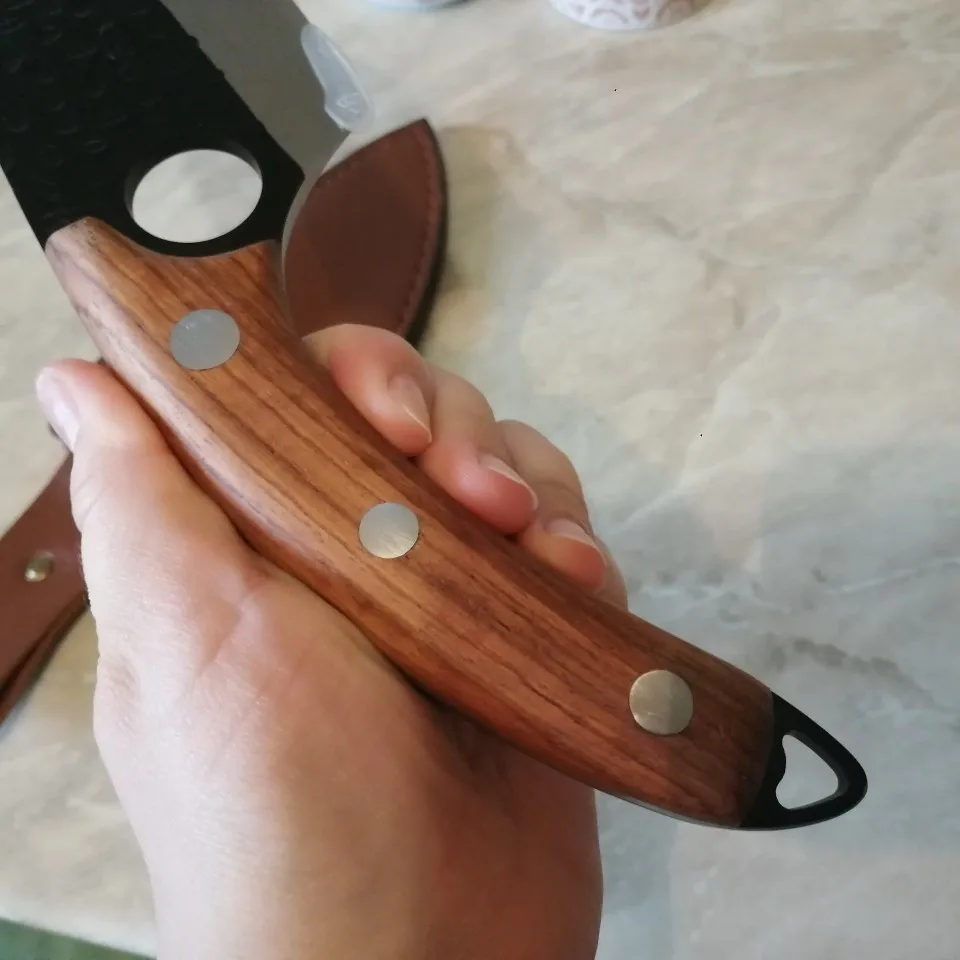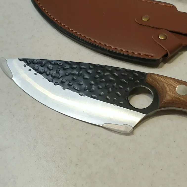 Очень понравился острый, отлично резать им мясо. В отверстие удобно ложится указательный палец, когда нужно приложить немного усилий. А вообще нож, конечно для мужской руки. Для женщины тяжеловат и крупноват. Нож очень красивый и острый, тяжёлый. Кованый сделан из высококачественной стали. Форма ножа заостренная, с изогнутой режущей кромкой и прямым обухом. Лезвие с двойной лазерной заточкой. Деревянная рукоятка с отверстием для подвешивания. Чехол из качественного ПУ, сделан аккуратно, с металлическими кнопками. Нож в чехле можно подвешивать за шлевки в поясу или просто хранить нож в чехле. Это очень удобно. Доставка около 3 недель в почтовом пакете и коробке. Острые концы года были с пластиковыми ограничителями.