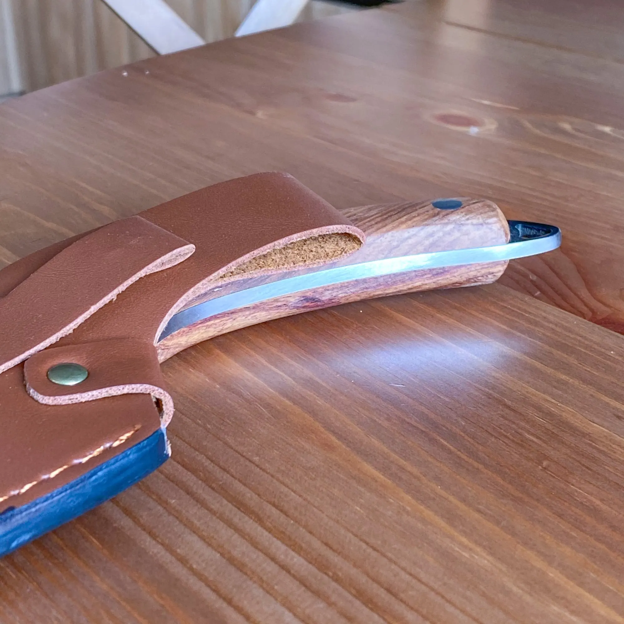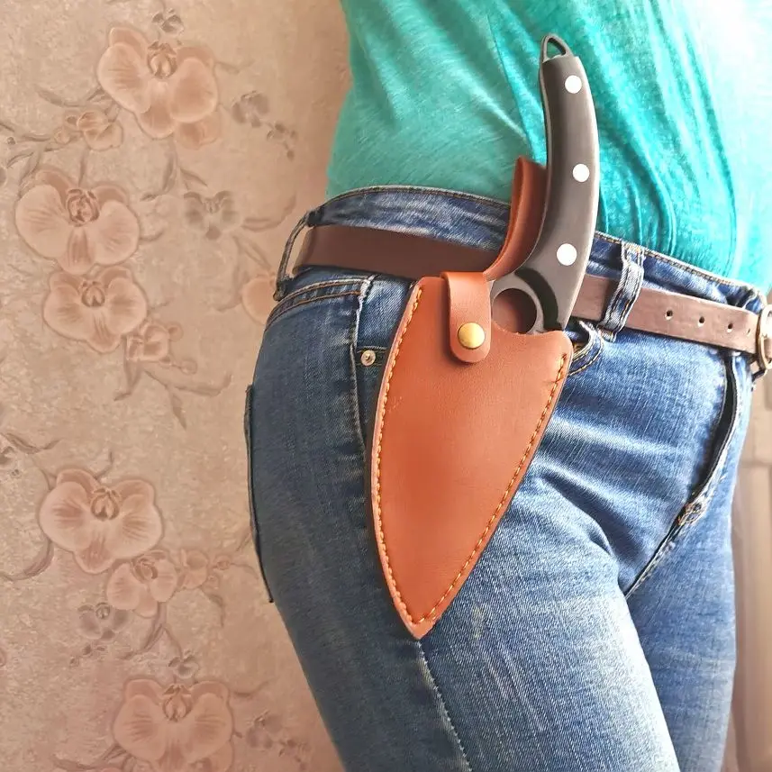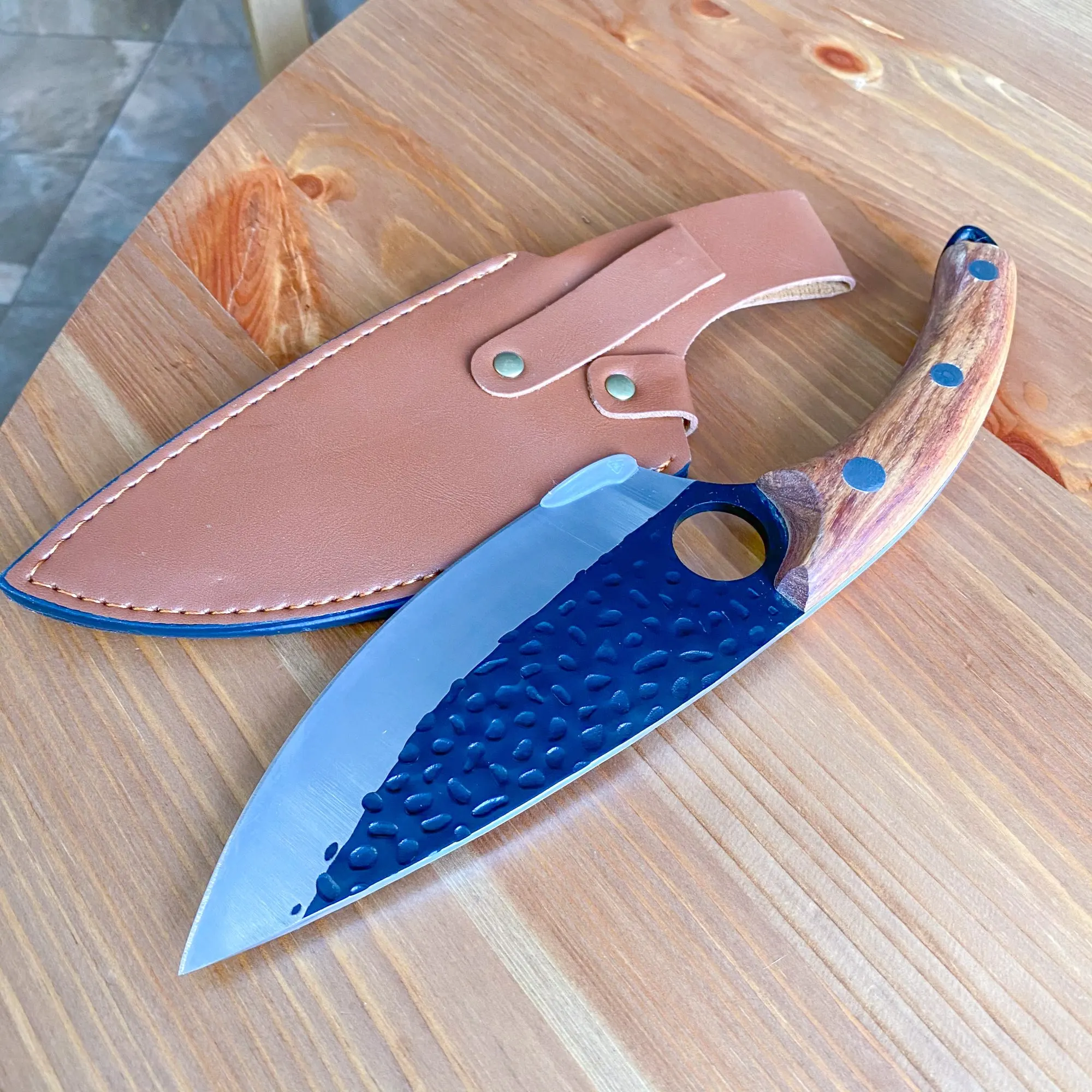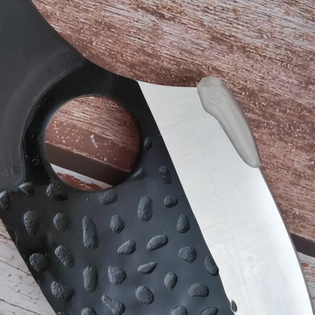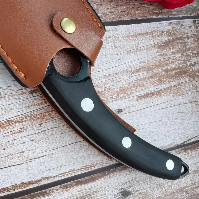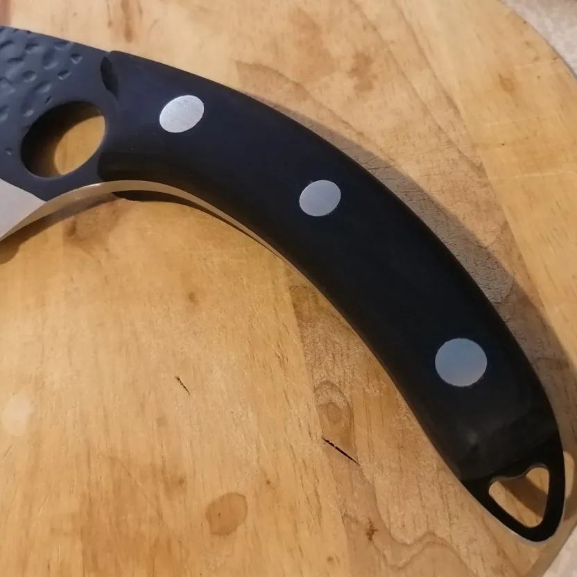 Очень понравился острый, отлично резать им мясо. В отверстие удобно ложится указательный палец, когда нужно приложить немного усилий. А вообще нож, конечно для мужской руки. Для женщины тяжеловат и крупноват. Нож очень красивый и острый, тяжёлый. Кованый сделан из высококачественной стали. Форма ножа заостренная, с изогнутой режущей кромкой и прямым обухом. Лезвие с двойной лазерной заточкой. Деревянная рукоятка с отверстием для подвешивания. Чехол из качественного ПУ, сделан аккуратно, с металлическими кнопками. Нож в чехле можно подвешивать за шлевки в поясу или просто хранить нож в чехле. Это очень удобно. Доставка около 3 недель в почтовом пакете и коробке. Острые концы года были с пластиковыми ограничителями.