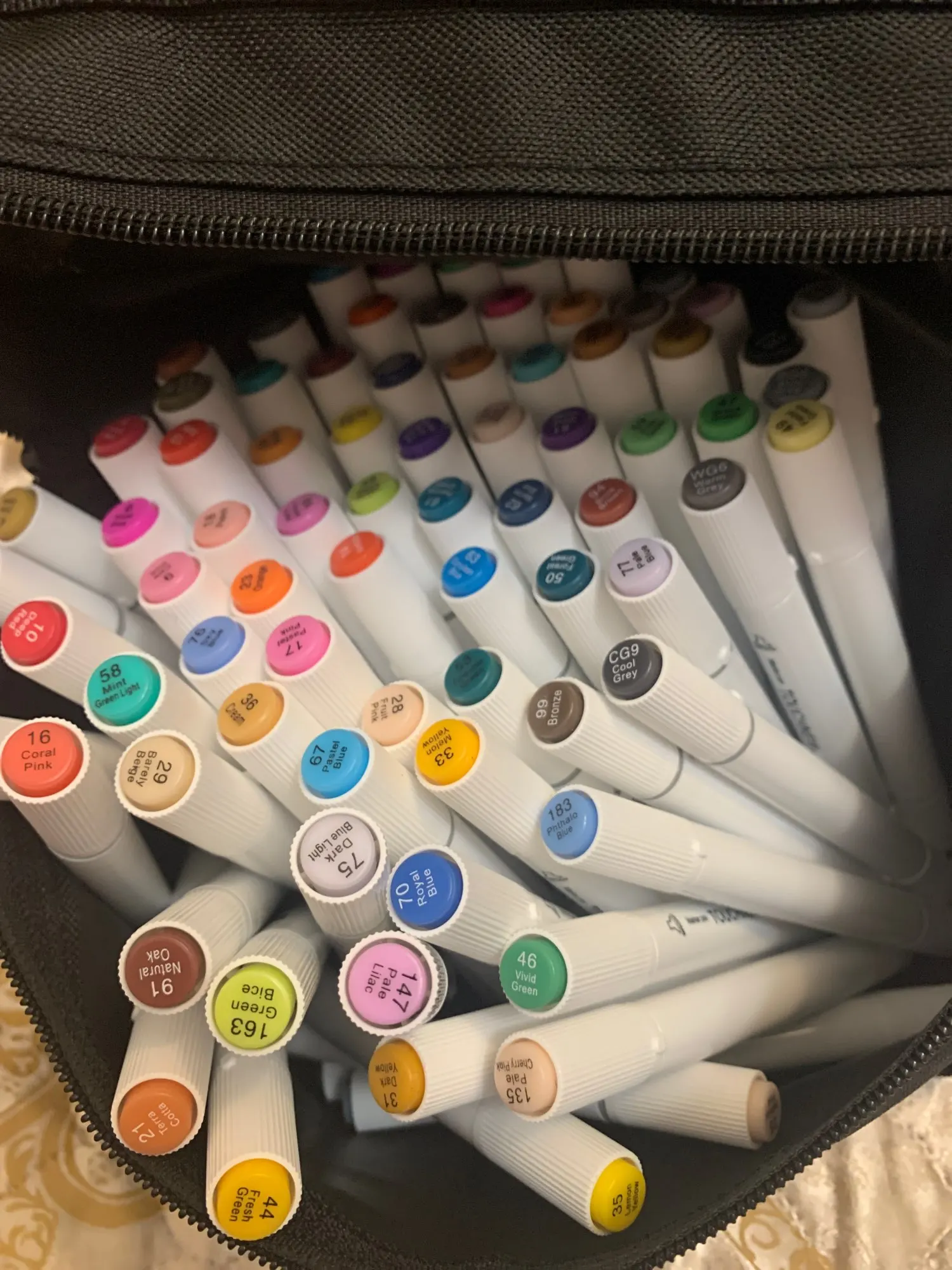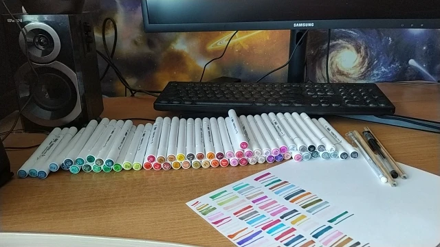 пришло быстро. сумка для фломастеров намного больше чем их количество, неудобно доставать, они все лежат и цветов не видно.