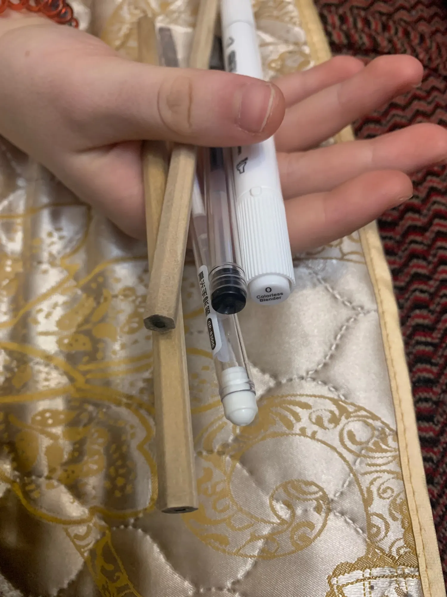 В подарок 2 простых карандаша, белая гелевая ручка, и белый маркер (сухой правда)