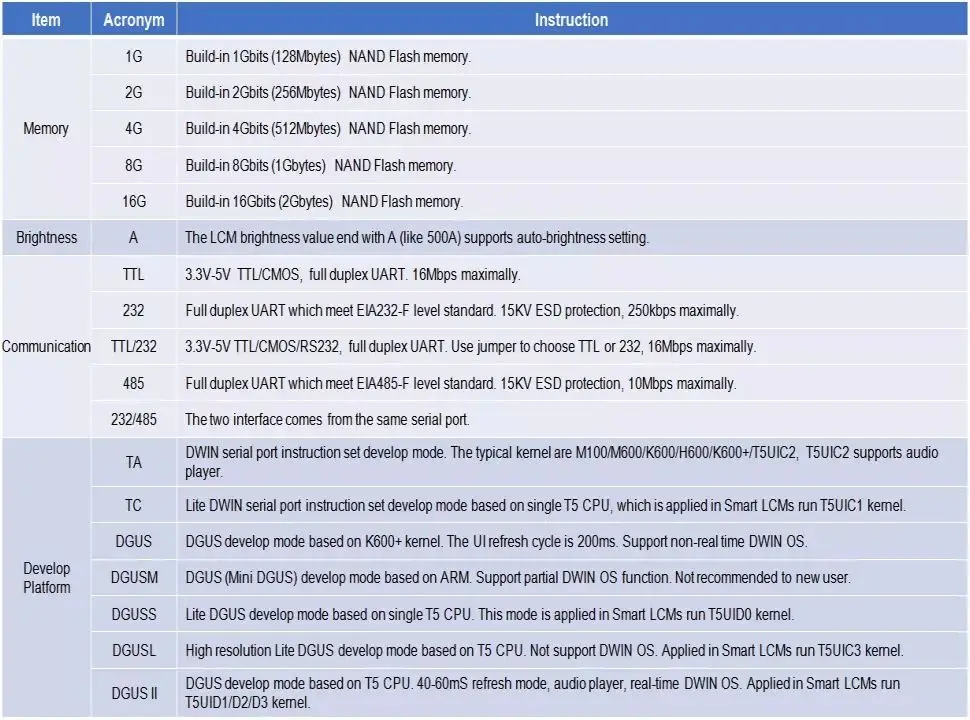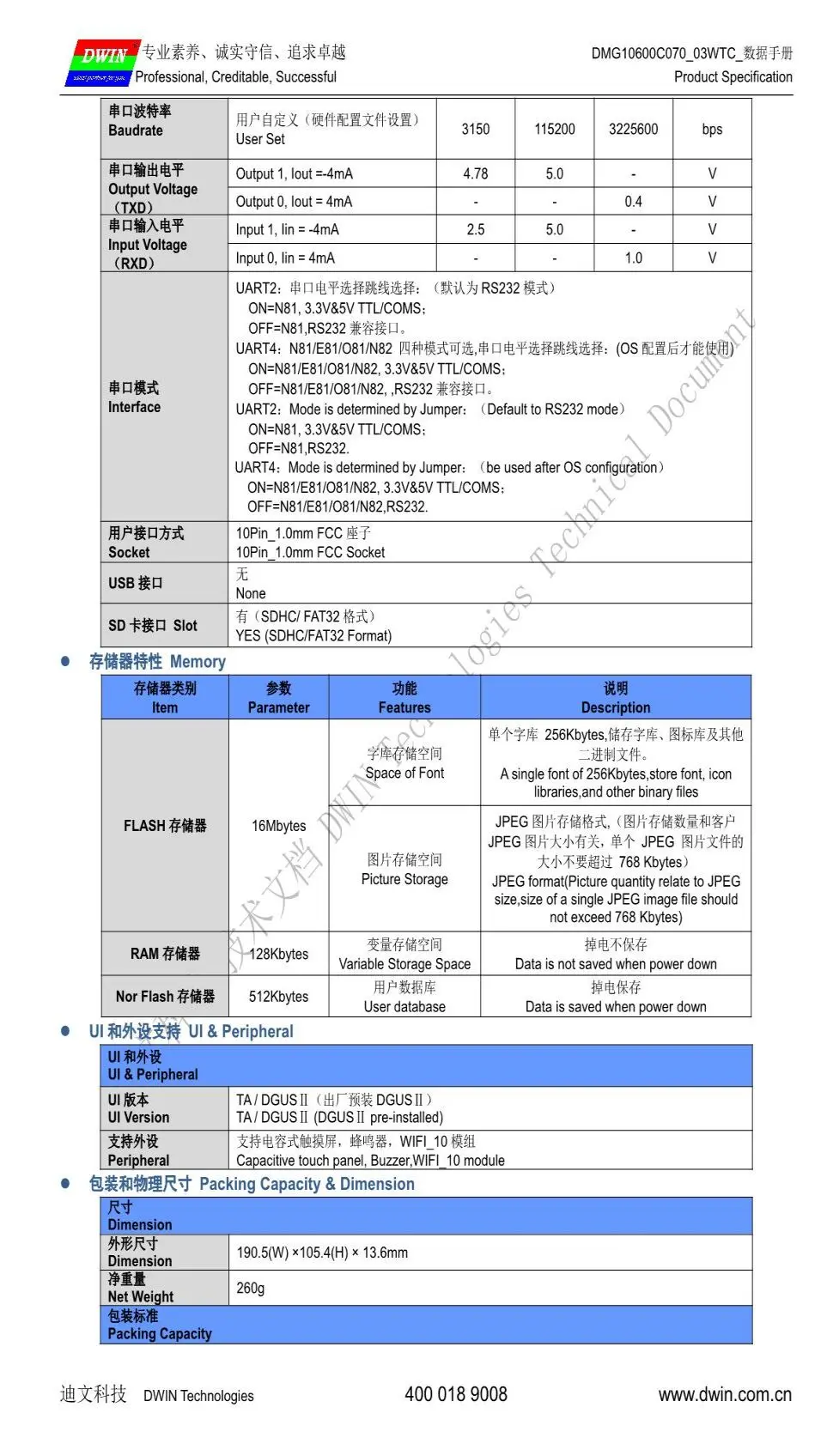 Технические спецификацииСуществует два режима разработки для модели No. DMG10600C070_03W. Один-DGUS II, другой-TA. Если вы предпочитаете стандартный набор инструкций, TA будет отвечать вашим требованиям. DGUS II находится под программным обеспечением DWIN DGUS, которое можно загрузить на официальном сайте. Вы можете достичь таких функций, как отображение текста/ввод, отображение данных/вход, кривые, загрузка данных, RTC и т. д.UART 2 под DWIN protocal. Если подключение к ПЛК под Modbus protocal, UART 4 доступно.Модель поддерживает любой MCU, такой как Arduino, STM32.