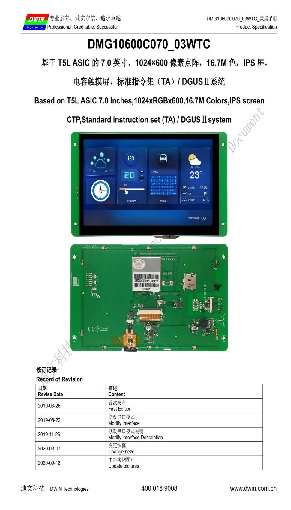 О DWINТехнология DWIN является ведущим мировым поставщиком высококачественных продуктов и решений для взаимодействия с человеческими машинами (HMI). Опираясь на лидирующие и конкурентные преимущества продукции с точки зрения функций, качества, услуг и цен, Продукты и решения компании DWIN Technology HMI широко используются в таких отраслях, как интеллектуальная техника, Новая энергия, финансовые машины, инженерное оборудование, искусственный интеллект e, экспортные механические и электрические продукты и медицинские, красота и здоровье и т. Д.О товарахНа основе T5L ASIC 7,0 дюймов, 1024*600,IPS TFT LCM, широкий угол обзора, поддержка WIFI модуля, DGUSII режим разработки. DGUS и DWIN OS (вы можете гибко проектировать интерфейс экрана, DWIN OS используется для вторичной разработки экрана) работает на отдельных 8051 ядер, цикл DGUS может быть коротким, как 20 мс, И анимацин очень гладкий.Что такое DGUS?DGUS является аббревиатурой графического сервиса приложений от технологии DWIN. Это интеллектуальное программное обеспечение GUI, полностью инновационное по технологии DWIN, и специальное программное обеспечение, которое уникально для технологии DWIN и затвердевшее в программном обеспечении. DGUSII-это обновленная версия DGUS, основанная на ЦП T5/T5L.Пожалуйста, свяжитесь со мной перед возвратом товара.