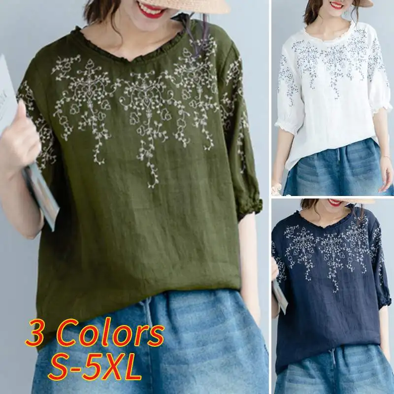 Посылка входит: 1 блузкаМатериал: 100% хлопокЦвета: темно-синий, зеленый, белыйРазмер: S,M,L,XL,2XL,Длина рукава: рукав до локтяВырез: круглый вырезУзор: Цветочная вышивкаУкрашение: вышивкаСтиль: ДосугСезон: летоПовод: семья