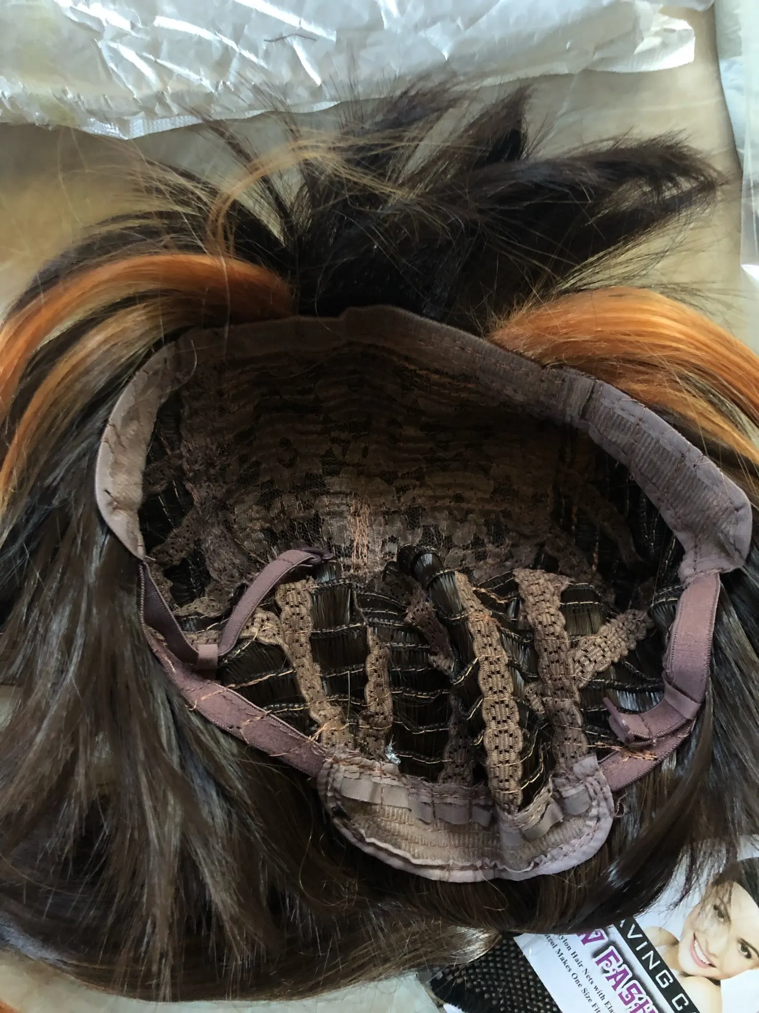 Доставка была довольно быстрой, она включает в себя сетку для парика, а парик, если он регулируется с помощью резиновых лент внутри.