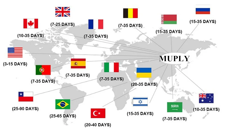 (2) около 9-30 рабочих дней в: Францию, Испанию, Грецию, Швецию, Бельгию, Германию;