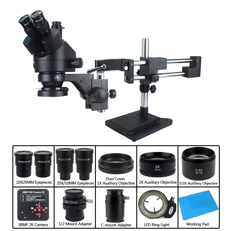 Микроскоп 3-кратный 90X 180X Simul-Focal с двойной стрелой, Тринокулярный стереомикроскоп с зумом, 38 МП, 2K HDMI, USB-камера, 144 светодиодный светодиодсветильник, микроскоп