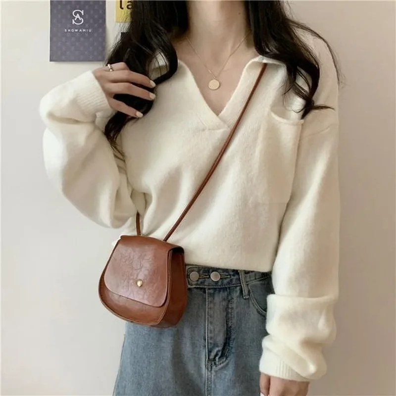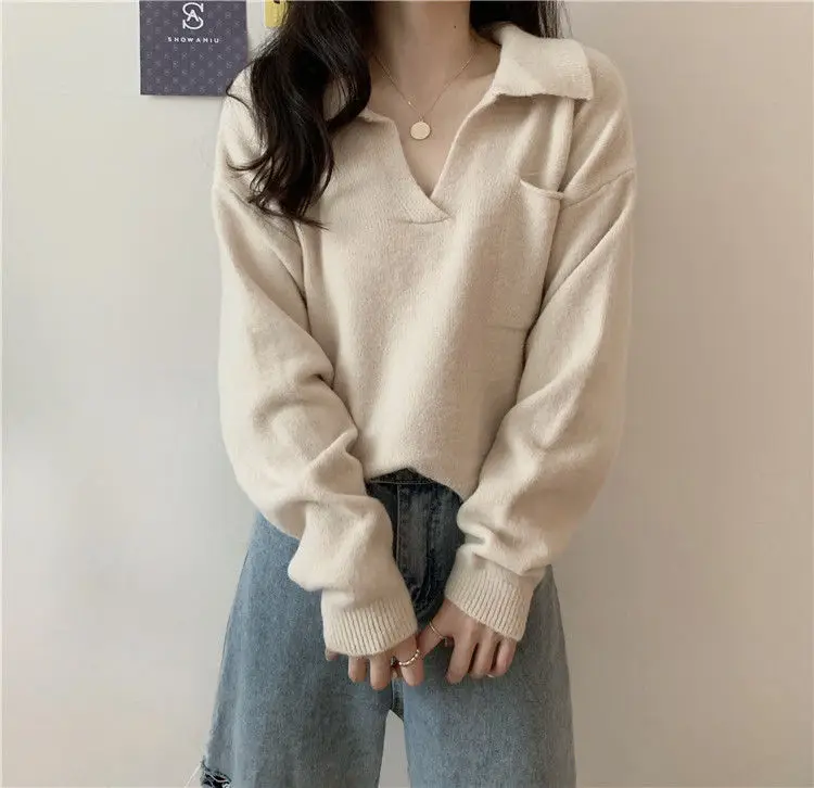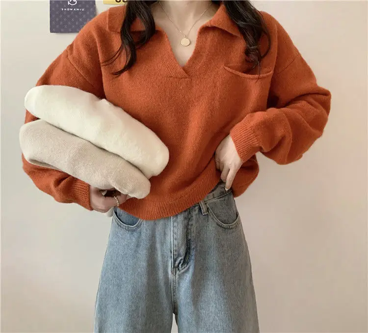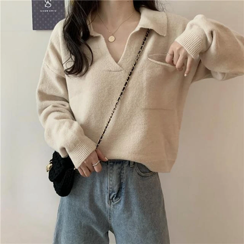 Свитера, пуловера, для женщин с v-образным вырезом, Женский вязаный свитер Тонкий Модный пуловер в Корейском стиле Стиль Досуг Элегантный шик свободный джемпер