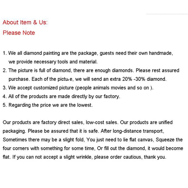 1. Алмазы из смолы несъедобные, не позволяйте детям играть, чтобы избежать несчастных случаев, таких как глотание.2. Чертеж должен быть чистым, в противном случае, на прочность клея влияет. Если есть адгезия грязи может повлиять на них с низкой температурой твердого железа.3. Алмазы, чтобы оставаться липкой резинкой.