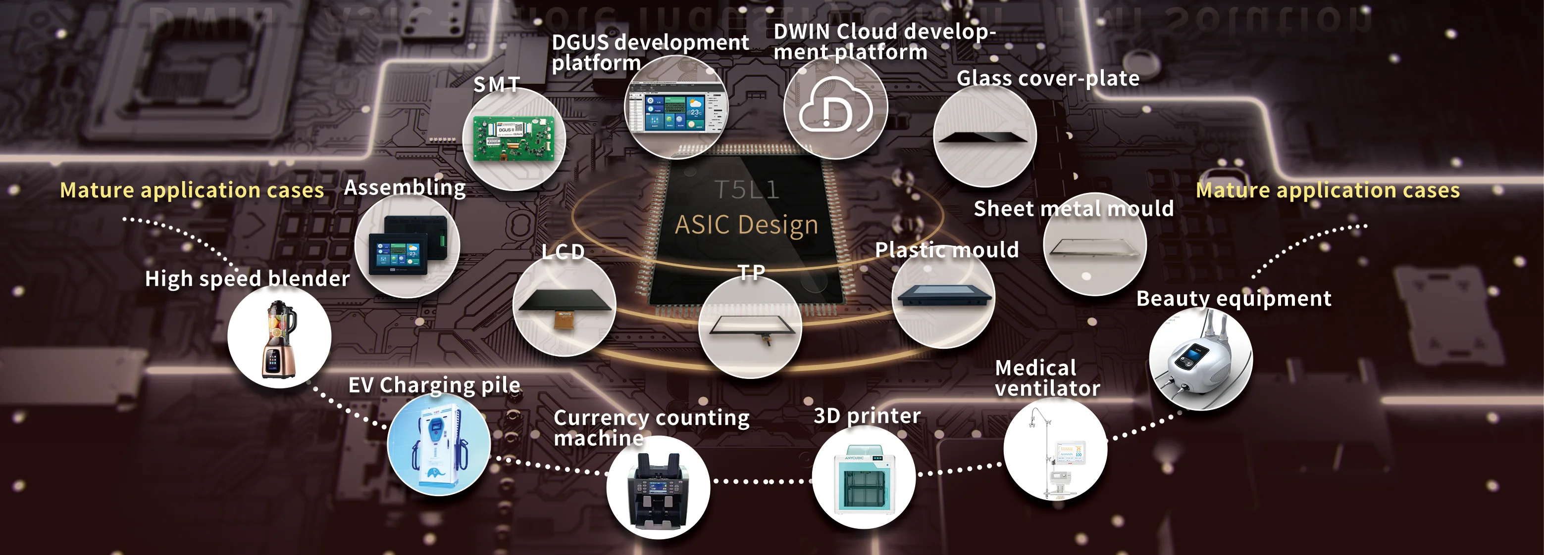 DWIN-одна из немногих компаний в отрасли, которая может самостоятельно разрабатывать и проектировать специальные чипы для взаимодействия между человеком и компьютером на основе рыночного опыта. Дизайн ASIC от DWIN устраняет избыточные функции общих чипов общего назначения, усиливает соответствующие показатели взаимодействия между человеком и компьютером (например, встроенная высокоскоростная ПАМЯТЬ видео и т. д.), помогает пользователям снизить общую стоимость оборудования, А также снижает сложность разработки интерактивной части, чтобы клиенты могли больше фокусироваться на своих основных технологиях, чтобы способствовать разработке и обновлению итераций продуктов и технологий