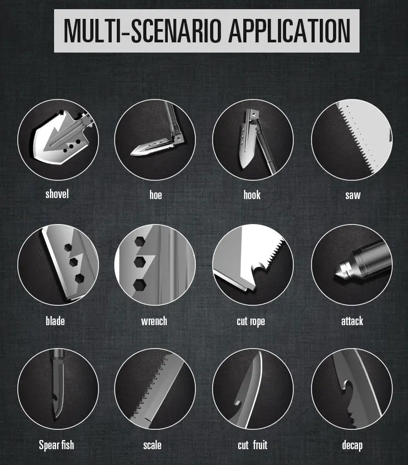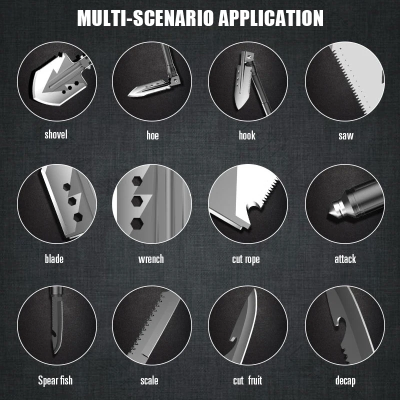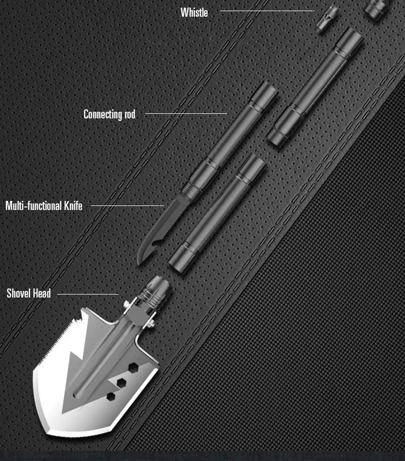 Лопата: 3CR13 высокотитановая марганцевая стальТвердость лопаты: 48 +Ручка: 6063 алюминиевый сплавСвисток: АБСКарманный нож: 3CR13Конус атаки: Оцинкованная железная поверхностьСумка для лопаты: 600D брезентВнешняя коробка: двойной гофрированныйЦветная коробка: Одинарная гофрированнаяВеревка: 2,5x400 мм 90 кгЛопата для снега размер 12,5*17 смОбщая Длина изделия: 76 см (3 трубки),92 см (4 трубки)Вес нетто 903 г (3 трубки),982 г (4 трубки)Вес брутто 1100 г (3 трубки),1180 г (4 трубки)Размер цветной коробки 26x14,8x5, 5 смРазмер коробки 32x30x55 смВес нетто в коробке 22 кг/23 кгИспользование:Наружная лопатаЛопата для выживанияЛопата для кемпингаМногоцелевая ЛопатаСкладная лопатаСкладная лопатаНаружная ШестерняОткрытый копатьМотыга для выживания
