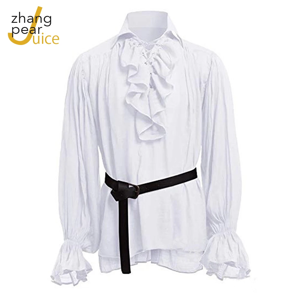 Рубашка мужская с длинными рукавами и оборками, винтажная блуза в викторианском стиле, в готическом стиле, стиле ренессанс средневековая рубашка с поясом, однотонная белая, Черная