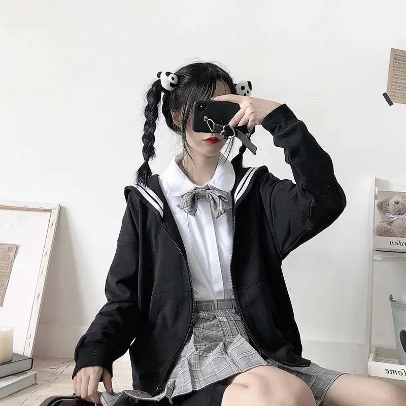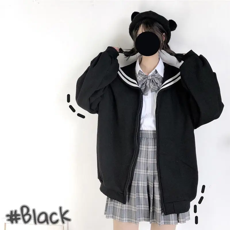 Толстовка Женская QWEEK, черная, на молнии, с матросским воротником, в японском стиле, большого размера, 2021