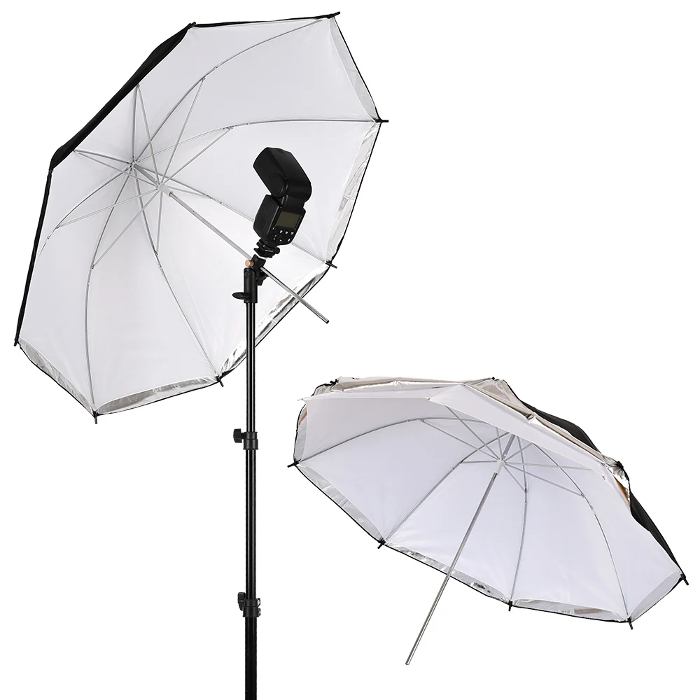 4 отражателя зонта/комплект | Серебряная отражающая внутренняя сторона и черная задняя сторонаСеребристый: свести к минимуму светильник потери и максимизировать светильник распространения для контраста и увеличения высокого светильник sИдеально подходит для портретов и съемки товараМатериал: серебристый светоотражающий и черный нейлонАлюминиевый вал | Размер: 83 см/33 дюймаРавномерно отражает и распределяет светильник | Устраняет блики и пятна