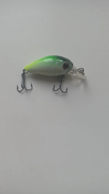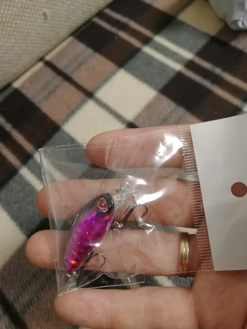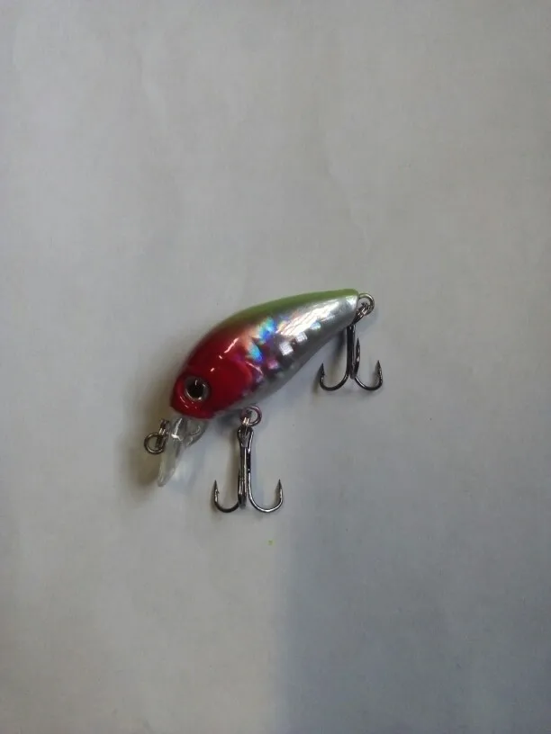 Воблерок маленький, длина воблера без лопатки 35мм. Крючки перехлёстываются, хотя соответствуют размерам приманки. Покраска нормальная, крючки и кольца лучше поменять на более качественные. Лучше оставить с одним тройником, чтобы небыло перехлёстов, поставить чуть крупнее. Петли можно не проклеивать. Заказал 6шт, все в разных расцветках. Пришло 7шт, продавец положил зелёных 2 шт. Спасибо продавцу.