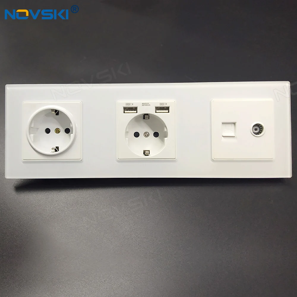 Настенный выключатель с белой стеклянной рамкой и функциональным ключом, английская розетка, французская розетка, порт USB 2,1 А, NOVSKI
