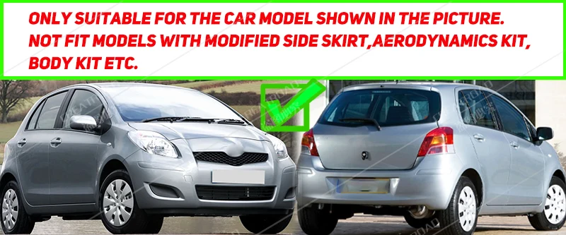 Фитинг: для TOYOTA YARIS / VITZ 3-dr & 5-dr хэтчбек 2005-2011 (XP90, Second Gen)Для Daihatsu Charade Hatchback 2011-2013Не подходят: 4-дверный седанНе подходит: модели «RS» или «TS»Только OEM шасси, не совместимо с боковыми юбками (наземные комплекты) или модификациями тела