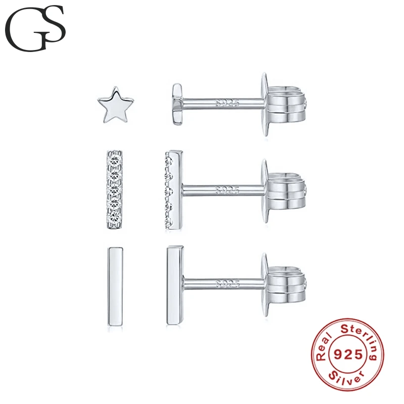 Женский комплект из 3 предметов, серьги из стерлингового серебра 925 пробы с цирконием S925 пробы, пирсинг, серьги-гвоздики, мини модные квадратные серьги со звездой