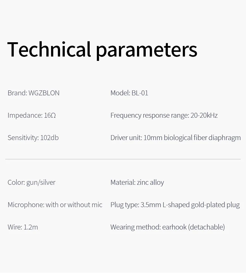 Бренд: BLON Модель: BL-01 Сопротивление: 160Ω Частотный диапазон отклика: 20-20 кГц Чувствительность: 102дб Блок драйвера: 10 мм биологическая волоконная диафрагма Цвет: пистолет/серебро Материал: цинковый сплав Микрофон: с микрофоном или без него Тип штекера: 3,5 мм l-образной формы с позолотой разъем Провода: 1,2 м Способ ношения: ушной крючок (съемный)