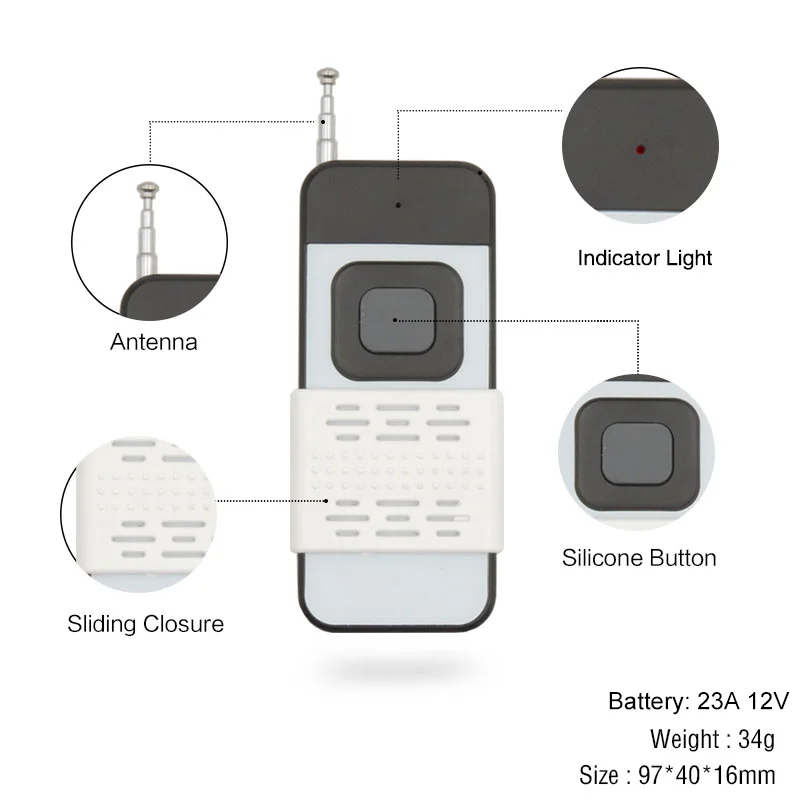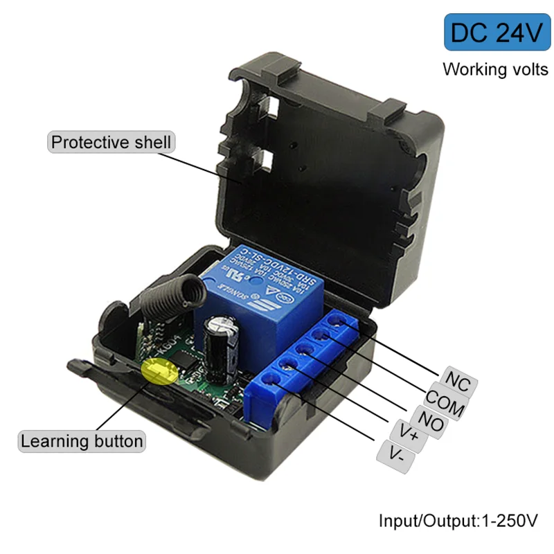 Рабочее напряжение: 24 В постоянного тока Входное напряжение: 1 ~ 250 В Выходная мощность: 1 ~ 250 В Ток покоя: <5 мА Максимальный ток: 10A Максимальная нагрузка: 2200 Вт Частота RF: 433 МГц Штырь: NO / COM / NC Рабочая температура: -30 ~ + 80 градусов Цельсия Чувствительность приема: >97dbm Количество пульта дистанционного управления: 25 шт. Поддержка кодирования: код 1527/фиксированный код 2262 Режим работы RF: ASK superгетеродинный беспроводной прием Диапазон приема: открытое пространство более 50 метров Удаленный режим работы: Мгновенный режим/режим переключения/режим блокировки/режим задержкиПродукты могут быть использованы в домах, фермах, фабриках, офисах, лабораториях, супермаркетах и так далее.Гаражные ворота с дистанционным управлением \ электрические двери \ домашние двери \ двери затвора \ раздвижные двери \ ворота \ дорожные воротаЭлектрический занавес с дистанционным управлением \ водяной насос \ вентилятор \ лампа \ светодиодный светильник \ лампа \ вентиляционное устройство \ сигнальная передачаIssion