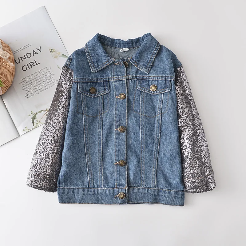 Детская джинсовая куртка с блестками, модная детская одежда для дев...