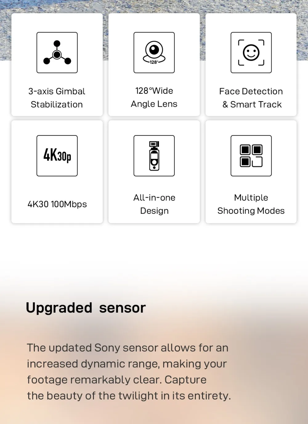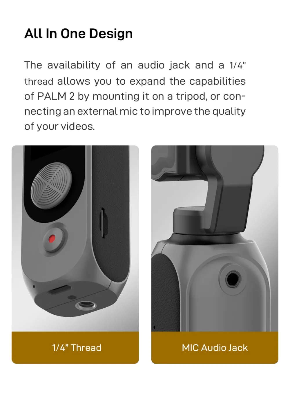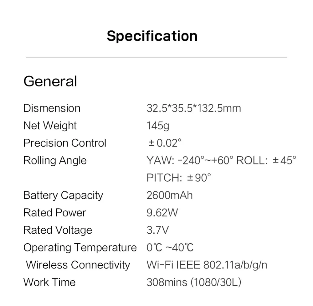 Улучшенный датчик увеличил динамический диапазон, делая его отснятый материал удивительно четким. Благодаря микрофону с шумоподавлением обеспечивается более чистое качество звука. Модернизированная Сервосистема и алгоритм стабилизации Подвеса могут эффективно устранить дрожь изображения в режиме реального времени. Оснащенный аккумулятором 2600 мАч, карданный подвес прослужит до 308 минут и даже дольше. Классический овальный дизайн в форме дорожки и теплоизоляционный материал делают шарнирный подвес меньше тапочек и более удобным, когда он держится в руке. Все в одном дизайне с аудиоразъемом и резьбой 1/4 позволяет установить его на штатив или подключить к внешнему микрофону. Сверхширокоугольный объектив 4K UHD 128 °. Поддержка беспроводного соединения со смартфоном со встроенным Wi-Fi Умное отслеживание: ладонь автоматически распознает лицо человека и следит за ним. Или вы можете нажать на объект на сенсорном экране, чтобы он оставался в центре картинки. Режим истории: приложение предоставляет не только множество шаблонов и узоров съемки одним касанием, но и предустановленные эффекты перехода и фоновую музыку. Вы можете легко превратить ваши кадры в Кинематографическое видео. Профессиональные, полированные работы у кончиков пальцев. Несколько режимов съемки: Видео timelapse/3X стабилизированная комната/замедленная съемка/панорама Посылка 1 х карданный 1 коробка 1 х зарядный кабель 1 х Руководство пользователя