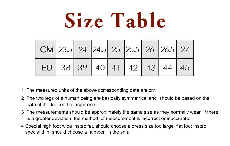 Пожалуйста, выберите правильный размер в соответствии с длиной стопы и таблицей.